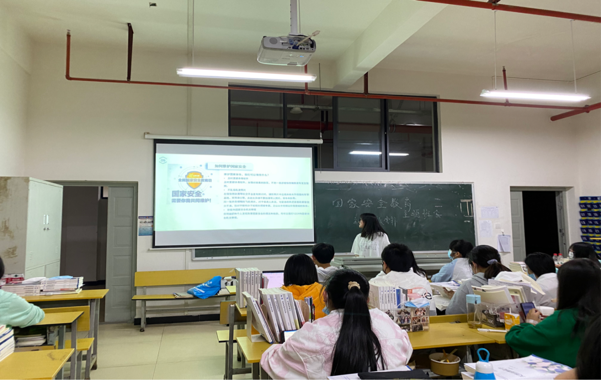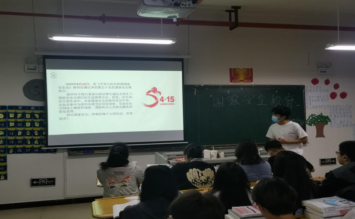 各班辅导员老师重点介绍了国家安全日的相关知识和日常生活中有关国家秘密的注意事项,并以网络舆论为主题,对学生进行了国主义主题教育,同时要求大家在网上注意言行,自觉维护良好的舆论环境和网络氛围;要求广大青年学生做好国家安全小卫士,遵守宪法,法律法规关于国家安全的有关规定,保守所知悉的国家秘密,了解并杜绝危害国家安全的行为,国家的希望在于青年,希望寄予青年。