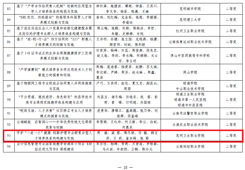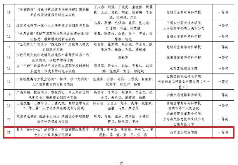日,云南省教育厅、云南省人力资源和社会保障厅发布了关于表彰云南省教学成果奖的决(教发〔202313)通知,经过单位申报、专家评审、网上公示和云南省教学成果奖评选表彰领导小组审定,beat365龙雨霏、李玉晶、王建松、李云飞、王思权、苏敏、周平、张磊团队的“服务--边’健康需求创新高职临床医学专业人才培养模式的探索”荣获一等奖(职业教育类);周璇、戚蓉、陶冬艳、任敏、韩亚莎、王莉、崔水峰、张路团队的“守护‘一老一小’健康创新护理专业群复合型人才培养体系的构建与实践”荣获二等奖(职业教育类)