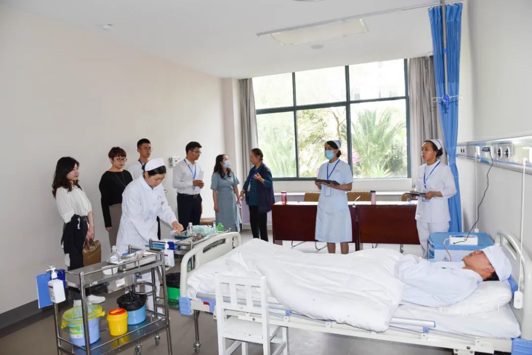 会议由现场观摩和座谈交流两部分组成。在国家卫健委能力建设和继续教育中心护理实操项目专家委员会主任张黎明教授、国家卫健委护理实操项目办副主任李安和蒋淑昆院长的带领下,与会人员首先实地参观了学院全国在校生护理实操能力考试考场,而后在护理学院411进行座谈交流。