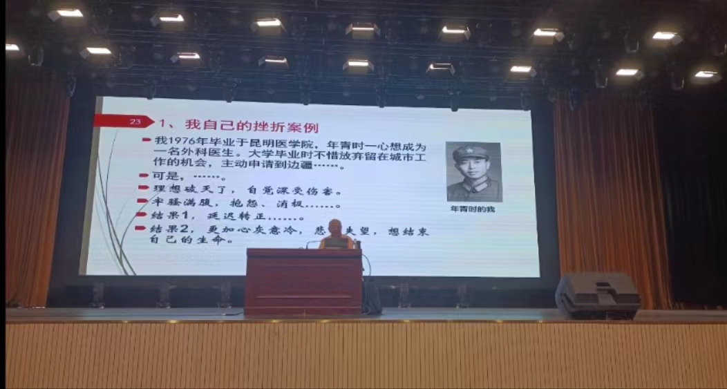 讲座开始,解教授解释了大学生心理问题的含义及解决心理问题的方法。他教学生们怎样把一句话的表达经过变换转为更容易让对方接受的方法。他还指出,多数人在人生发展过程中都会出现不同程度的发展与适应问题。因而,树立科学的人生观、形成正确的自我观念、有效控制情绪并保持良好心境、改变人际交往理念、培养良好的生活习惯和业余爱好、进行合理的心理调适以及求助心理咨询机构帮助等成了解决心理问题的方法。紧接着,他向大家讲述了自己的挫折案例,并提到了同学们在大学生活中常见的问题以及应对策略。在大学生活中难免会遇到人际关系、独立生活、个人管理等方面适应不良的现象。当遇到这些问题时大家不必沮丧,应当努力增强个人对未来的预测能力,提高应变能力、承受挫折能力,开放自己,寻求支持,并明确个人任务、树立恰当的个人目标。学会正确对待自己的挫折,才能使生活变得更加幸福和灿烂光明。