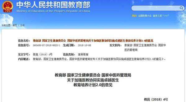 教育部国家卫生健康委员会国家中医药管理局关于加强医教协同实施卓越医生教育培养计划2.0的意见教高〔2018〕4号各省、自治区、直辖市教育厅(教委)、卫生计生委、中医药管理局,新疆生产建设兵团教育局、卫生计生委,有关部门(单位)教育司(局),部属各高等学校、部省合建各高等学校:为深...