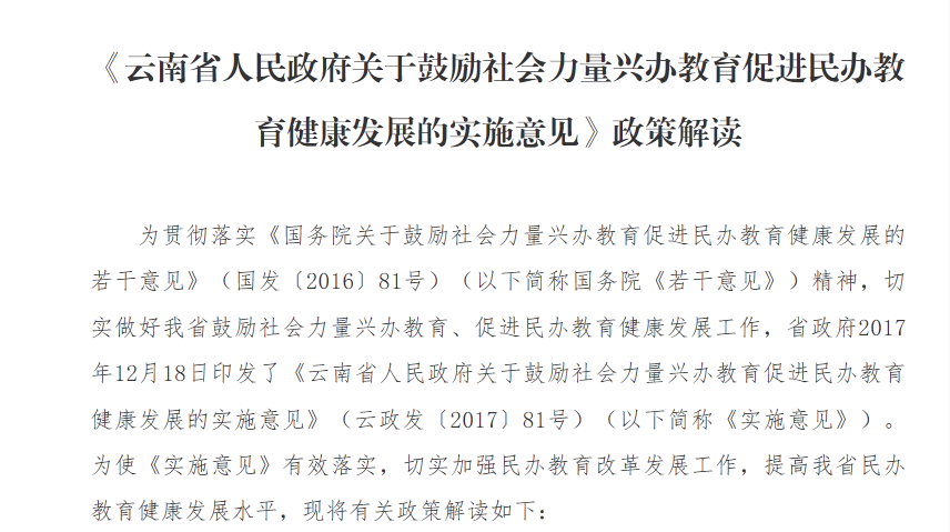 《云南省人民政府关于鼓励社会力量兴办教育促进民办教育健康发展的实施意见》政策解读原文见云南省教育厅网站:http://www.ynjy.cn/web/bb42467ddab141d892d831366e37b7df/516f7c91be0d43ebb6de6d1bfbd5fa77...