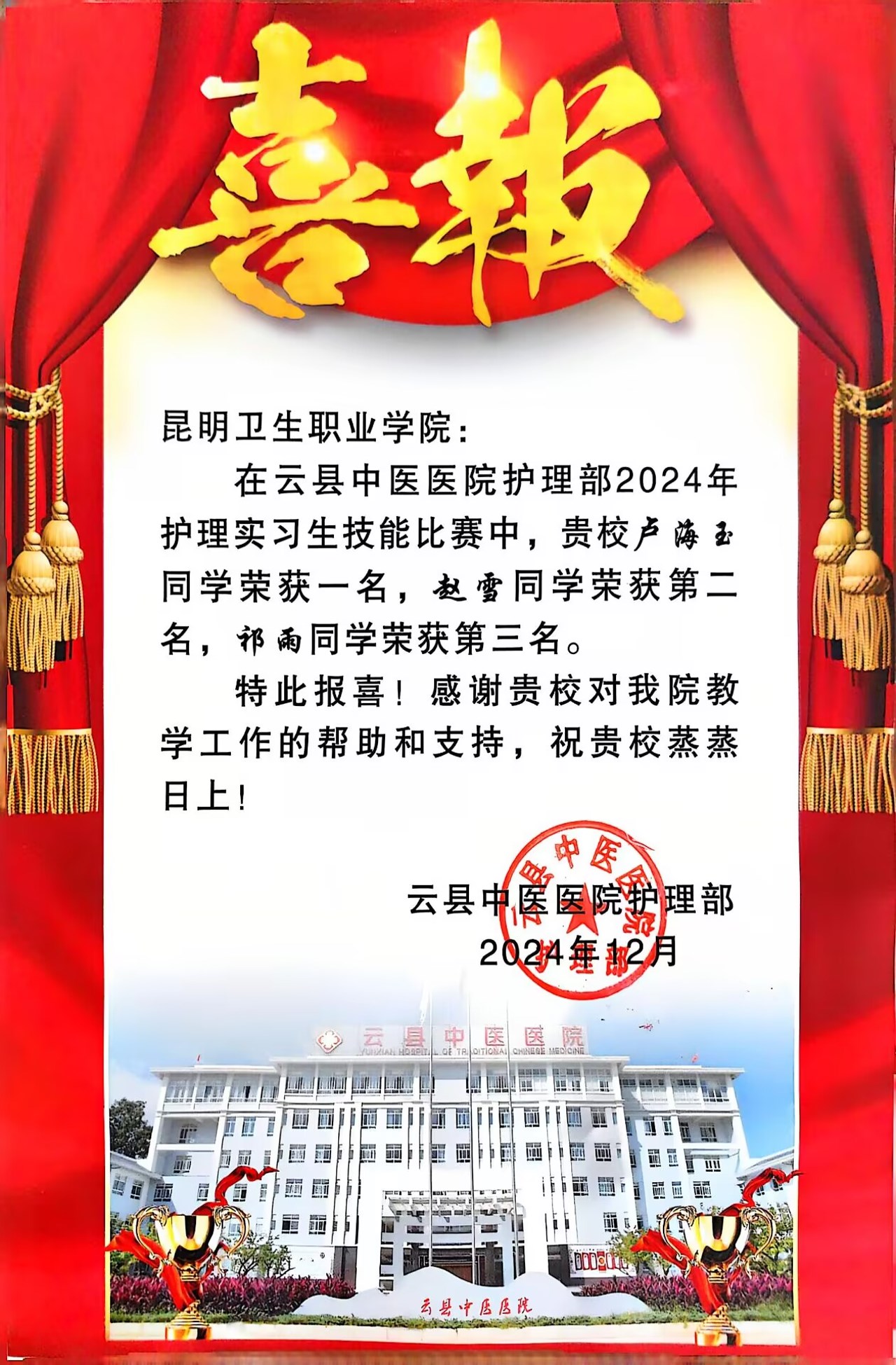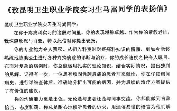 beat365实习生表现优秀云南大学附属医院发来表扬信