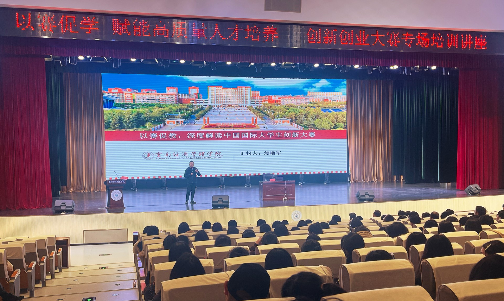 为深入理解中国国际大学生创新大赛(原“互联网+”大赛)精神,准确把握大赛导向,提升学院创新创业教育水平与参赛项目质量,12月16日,特邀云南经济管理学院创新创业学院院长焦艳军教授来校,开展题为“以赛促学,赋能高质量人才培养”的专题讲座。