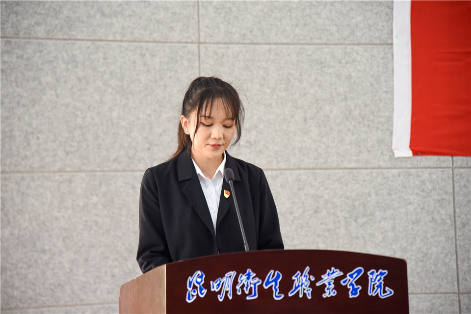 伴着着庄严的《国际歌》,入党宣誓仪式正式开始。党委副书记张晓刚同志宣读了参加入党宣誓的预备党员名单,随后新党员面向党旗,举起右手,在组织部副部长李睿雯同志的领誓下,用慷慨激昂的语气,庄严向党旗宣誓,表达对党的忠诚、为共产主义事业奋斗终身的决心。随后,2019级高职护理2班陈丹代表新党员发言,她表示通过入党宣誓仪式体会到加入党组织的神圣,受到了精神的洗礼,更加坚定了她为共产主义事业奋斗终身的信心和决心,在今后的学习、工作和生活中她将按照党员的标准严格要求和鞭策自己,加强理论知识学习,提高专业素养,努力做好本职工作,以身边优秀党员作为学习的榜样,时刻保持共产党员的先进性和先锋模范作用,用实际行动争做一名优秀的共产党员。