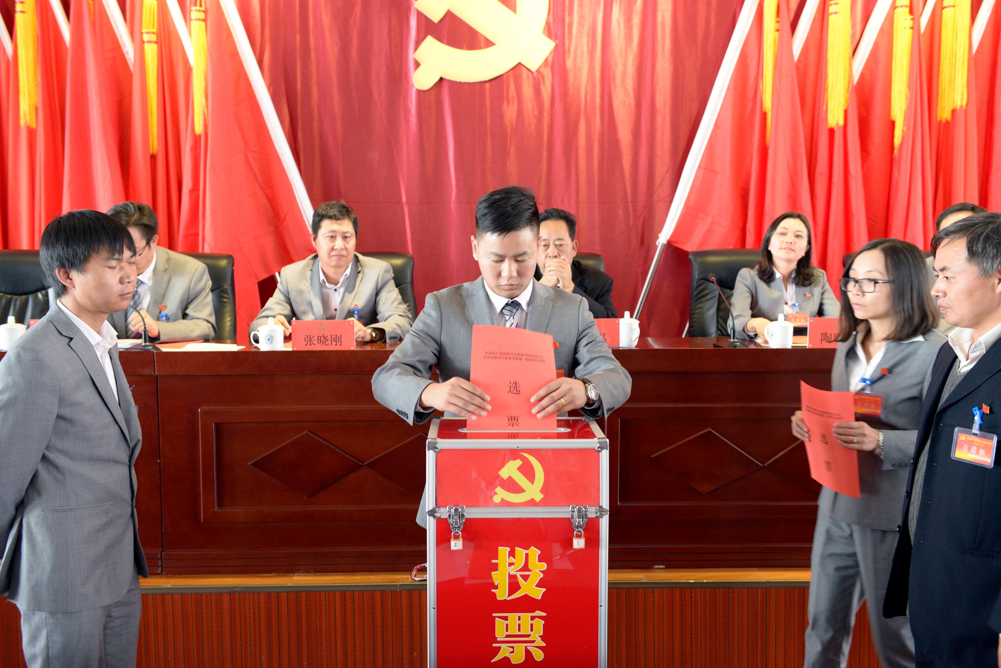 按照《中国共产党章程》和《中国共产党基层组织选举工作暂行条例》要求,大会通过投票选举产生了由王斌、龙正昌、张晓刚、周平、陶晓燕为委员的新一届中共beat365平台官方网站委员会。