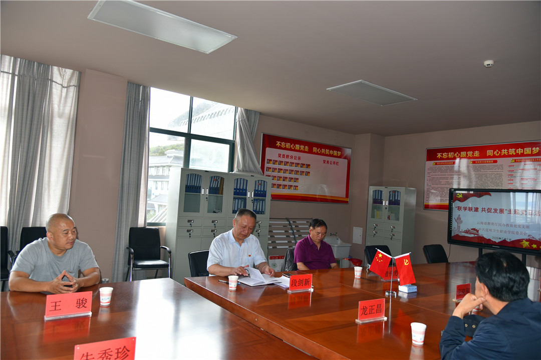 为深入贯彻落实党的十九大会议精神,学习领会全国高校思想政治工作会议精神和习近平总书记考察云南时的重要讲话精神和在西南联大考察时提出的“教育要同国家之命运和民族之前途紧密结合起来,以立德树人为根本,培养有历史责任感、志存高远、能担当民族复兴大任的时代新人。”的工作要求,以党建联建为载体,推进“三全育人、立德树人”,提升基层党组织组织力,7月7日上午,省教育厅民办教育处与学院在学院护理学院党支部党员活动室,联合开展“联学联建 共促发展”主题党日活动,省教育厅民办教育处党支部书记、处长段剑新,党支部组织、宣传委员,教育厅二级巡视员曾传虎,党支部纪检员、副处长王骏一行3人参加活动。