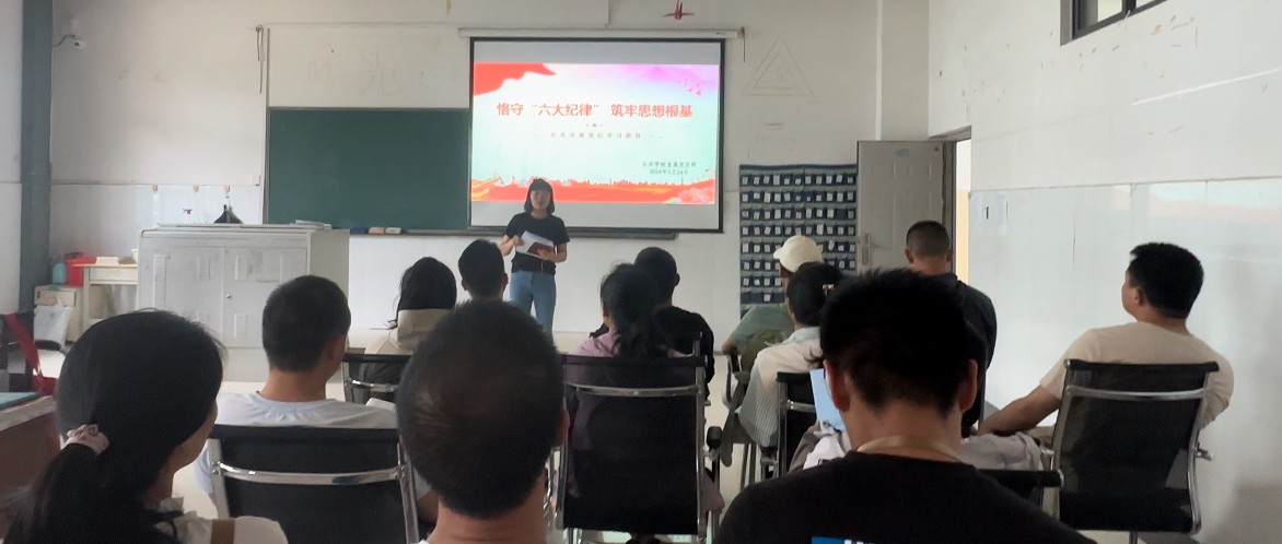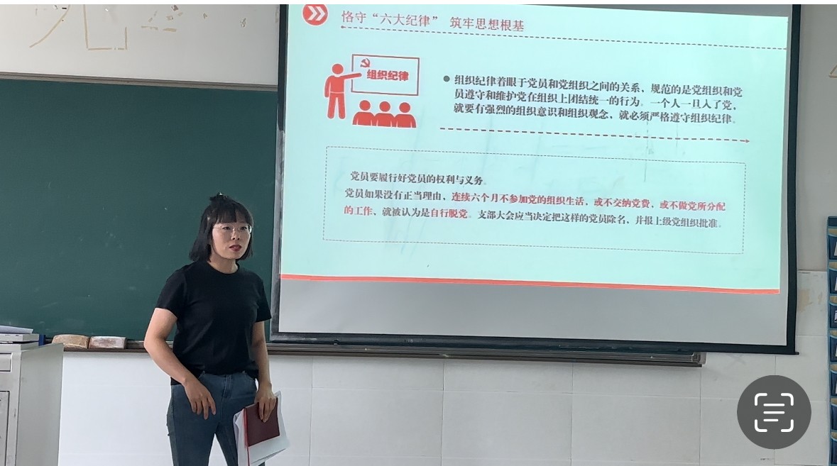 为深入开展党纪学习教育,推动支部党纪学习教育走深走实,教育引导党员干部学纪、知纪、明纪、守纪,5月27日上午,公共学院直属党支部书记杨丽琴以“恪守”六大纪律,筑牢思想根基为题给支部党员讲授了一堂纪律党课。