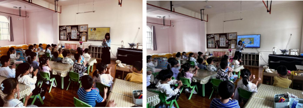 杨曦同志果果二班的《We love animals》英语课,针对幼儿园小朋友的特点,设计了《baby shark》手指舞作为课前热身导入活动,手指舞调动了学生积极性,提高了学生的兴趣;然后利用猜谜语的方式引出本节课需要学习的动物的单词,便于学生理解和记忆;再利用多种方式(分组、开火车、大小声朗读等)重复跟读单词,以达到记忆的目的;随后利用朗朗上口、便于唱诵的chant,设计动作,带学生一边唱歌一边记忆英语单词,在娱乐中轻松愉快的学习。在杨老师课堂中,课堂气氛轻松活跃,又具有亲和力,学生们积极举手作答,不断尝试突破自我,小朋友们通过此次课堂的学习,对英语有了新的认识,提高了对英语课的兴趣。