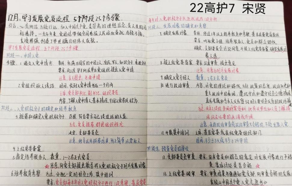 为深入学习贯彻习近平新时代中国特色社会主义思想,全面贯彻落实党的二十大精神,鼓励青年同学加强党的创新理论武装,紧跟中央时事,为奋进新征程凝心聚力,激发党员学习热情。2023年12月11日晚上,护理学院第一党支部面向支部党员、入党积极分子、入党申请人开展“晒笔记 亮成果 促学习”学习笔记评选活动。