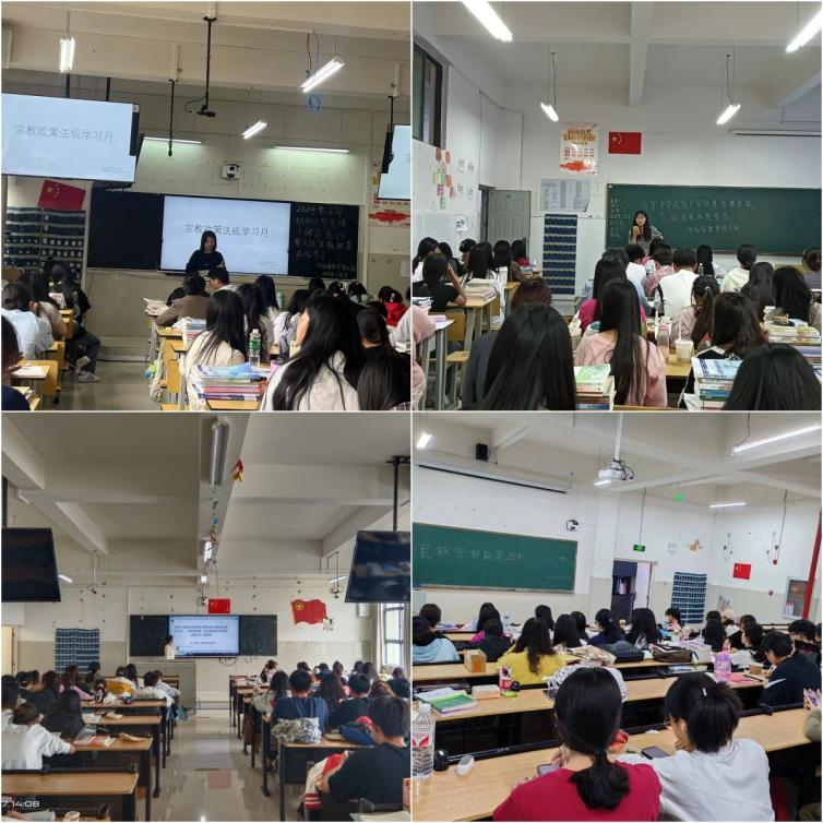 班会上,各班团支书为同学们讲解了中国特色社会主义民族宗教理论、马克思主义宗教观、党和国家关于宗教工作的基本方针政策等有关内容,带领同学们学习了宗教事务方面的基本知识,帮助同学们树立正确的宗教观、理清宗教和科学的关系、把握校园文化价值导向,防范抵制非法宗教活动。要求同学们做到不进宗教场所、不参加宗教活动;不参与宗教聚会;不擅自举办宗教活动;不参加非法宗教组织和非法宗教活动;在学习中认真遵守学校纪律,维护学校正常教学秩序。