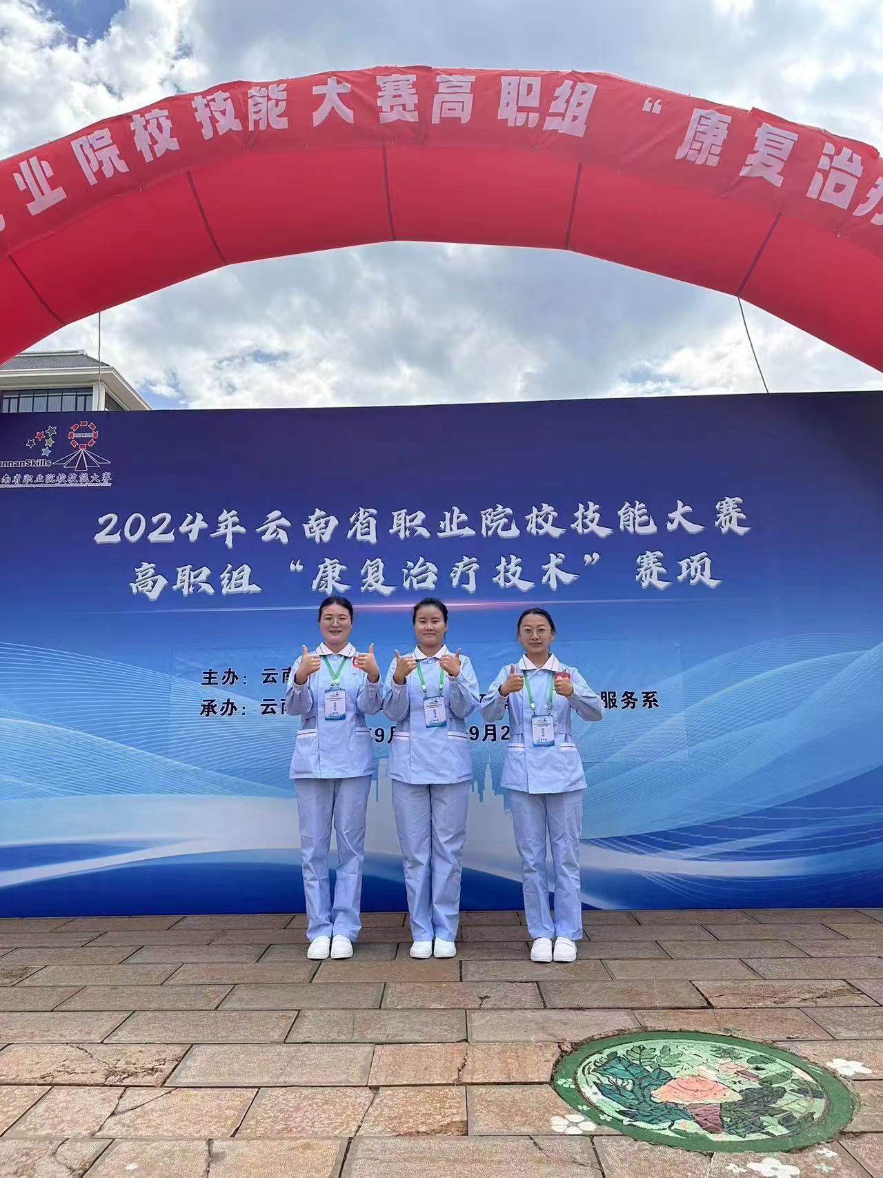 在2024年云南省职业院校技能大赛高职组“康复治疗技术”赛项中,由陈莹、李姣教师指导的,来自2022级三年制专科康复1班童绍芬、蔡凤露和2022级三年制专科康复2班李红香,同心协力,凭借过硬的心理素质和扎实的专业技能,荣获一等奖;同时由刘瑞琴、龙思思教师指导的,来自2022级三年制专科康复2班李蕊、孟正尧和2022级三年制专科康复1班周芸旭,荣获二等奖。