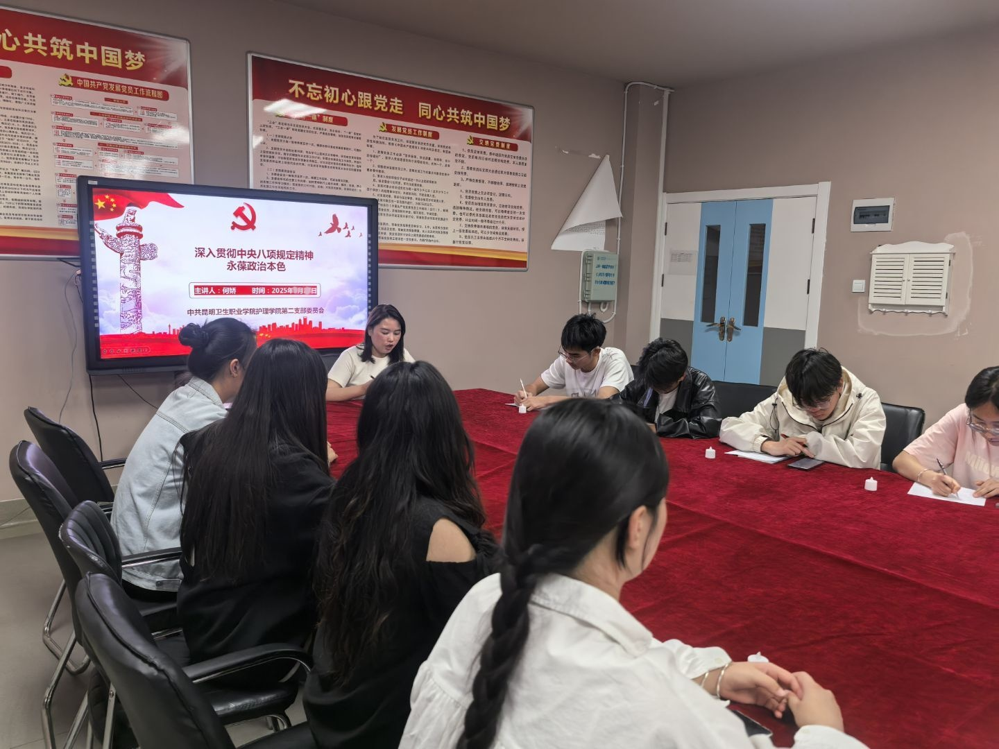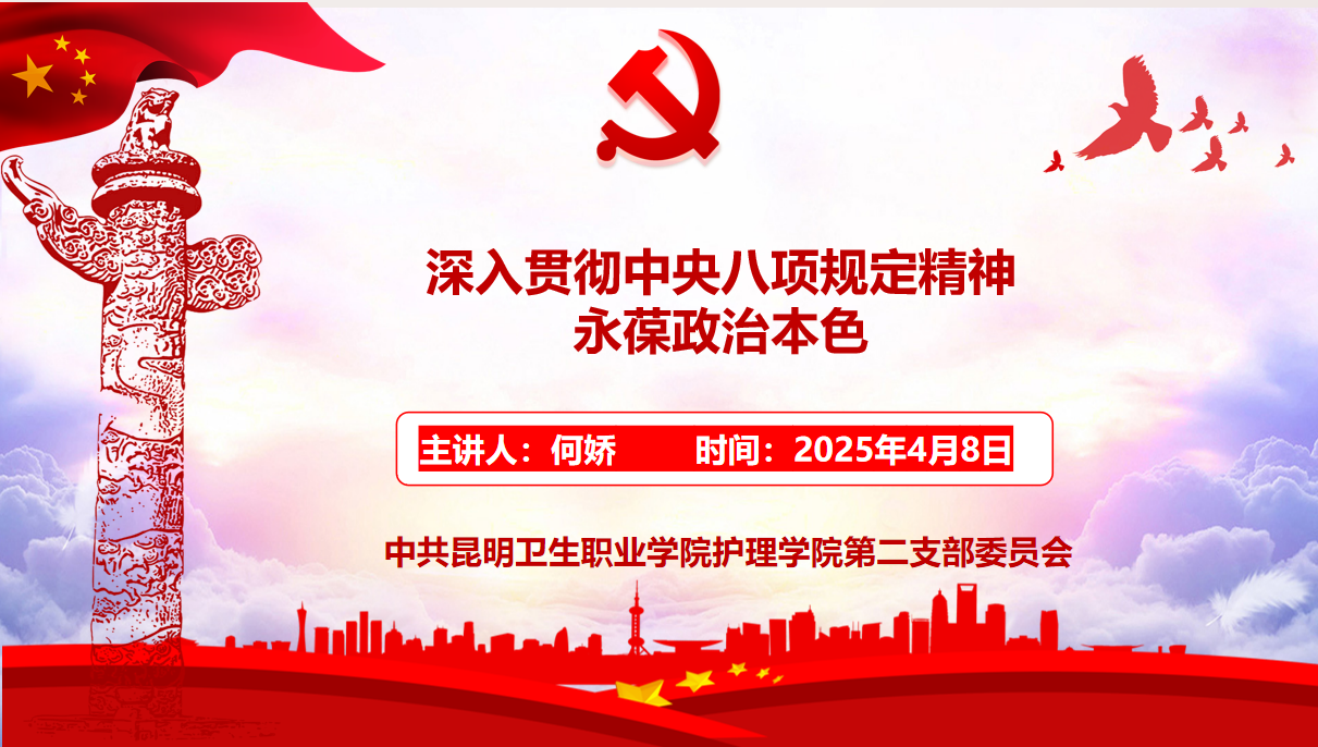 4月8日,护理学院第二党支部以党课形式,开展“以八项规定为旗,扬作风建设之帆”深入贯彻中央八项规定精神专项学习活动,成效显著。此次党课由党支部负责人何娇同志主持,支部党员积极参与。
