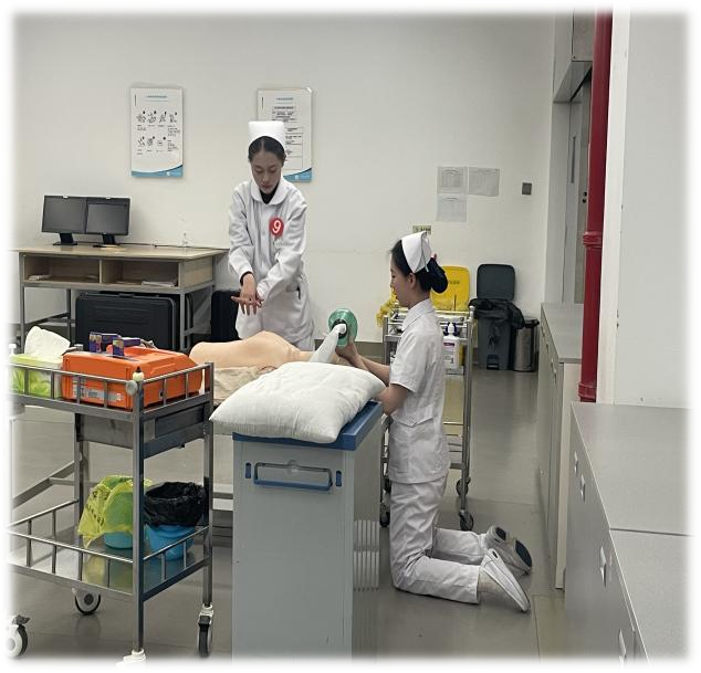 决赛现场,护理学院1-502与503实训室化身急救战场。选手们在15分钟内完成双人心肺复苏与静脉输液两项核心技能操作,从判断意识、开放气道到精准穿刺,每个环节都考验着专业素养与心理素质。“按压深度需达到5-6厘米,频率保持每分钟100-120次”,评委教师紧盯操作细节,“这不仅是技术考核,更是对生命敬畏之心的检验”。