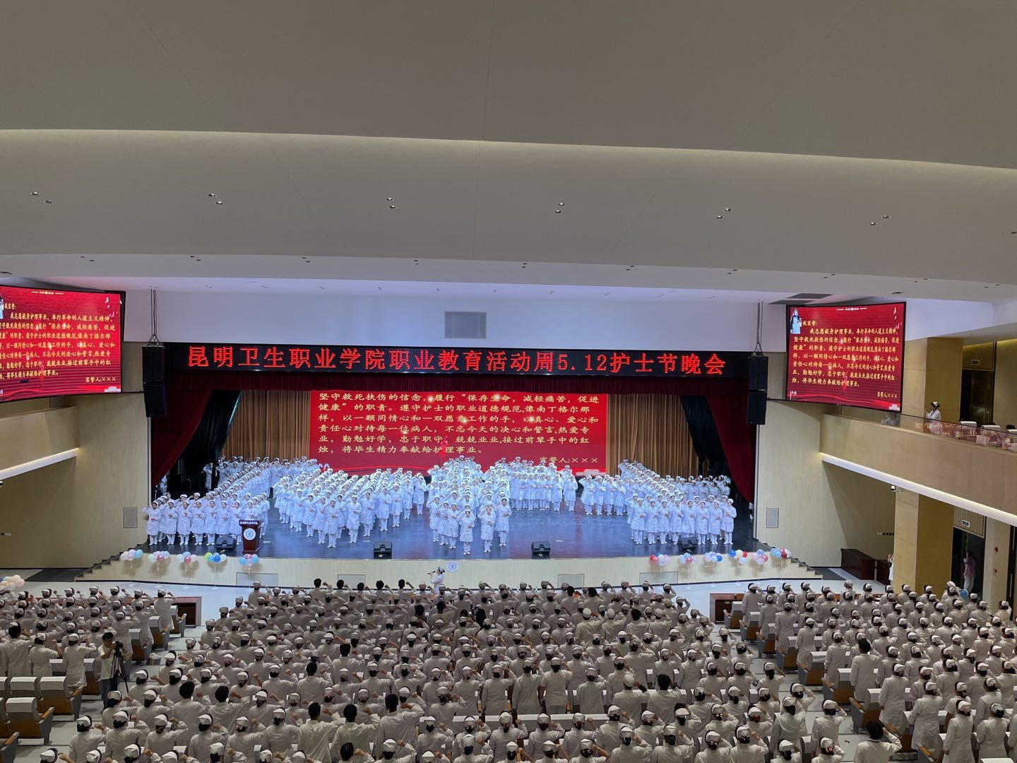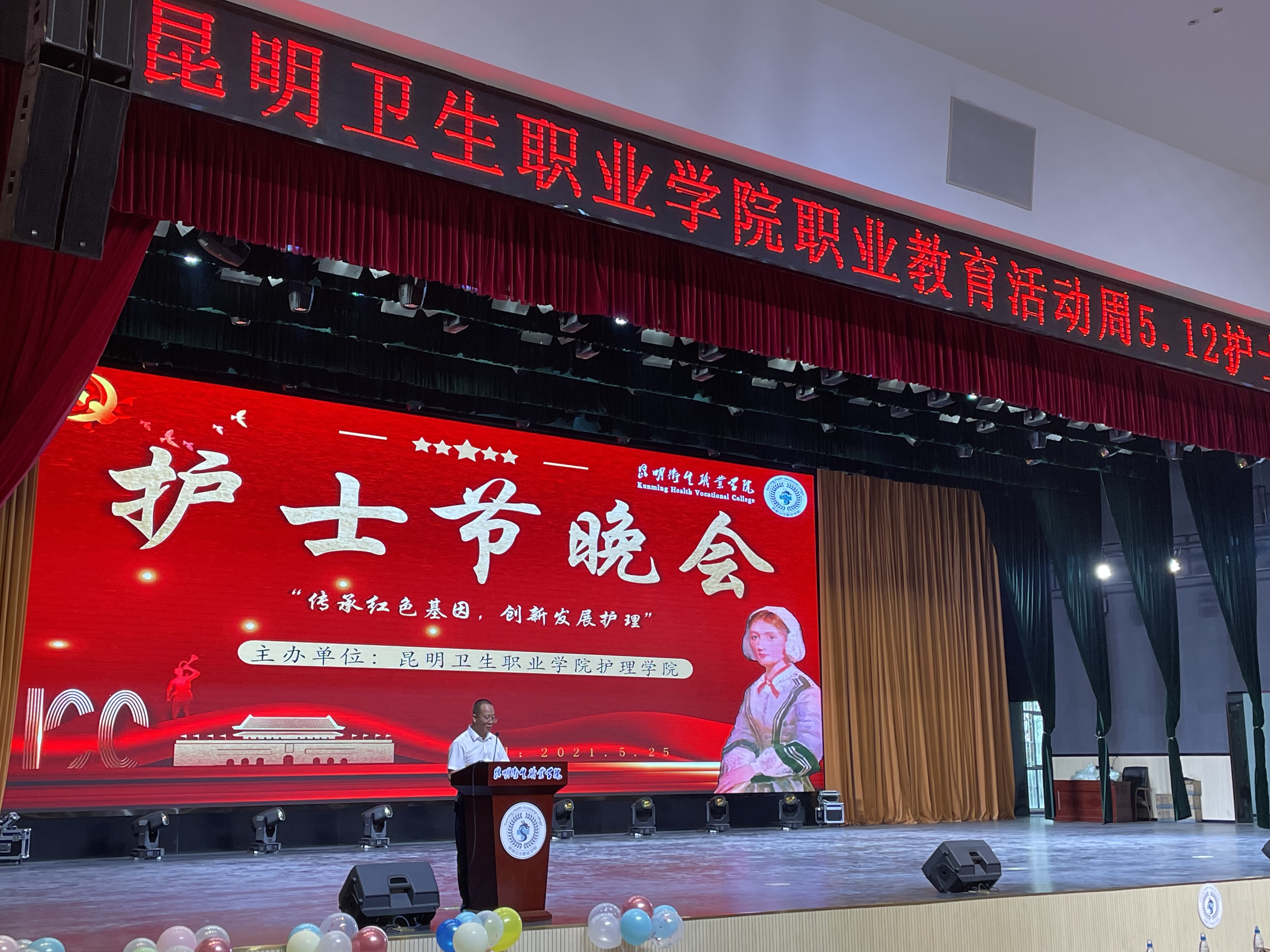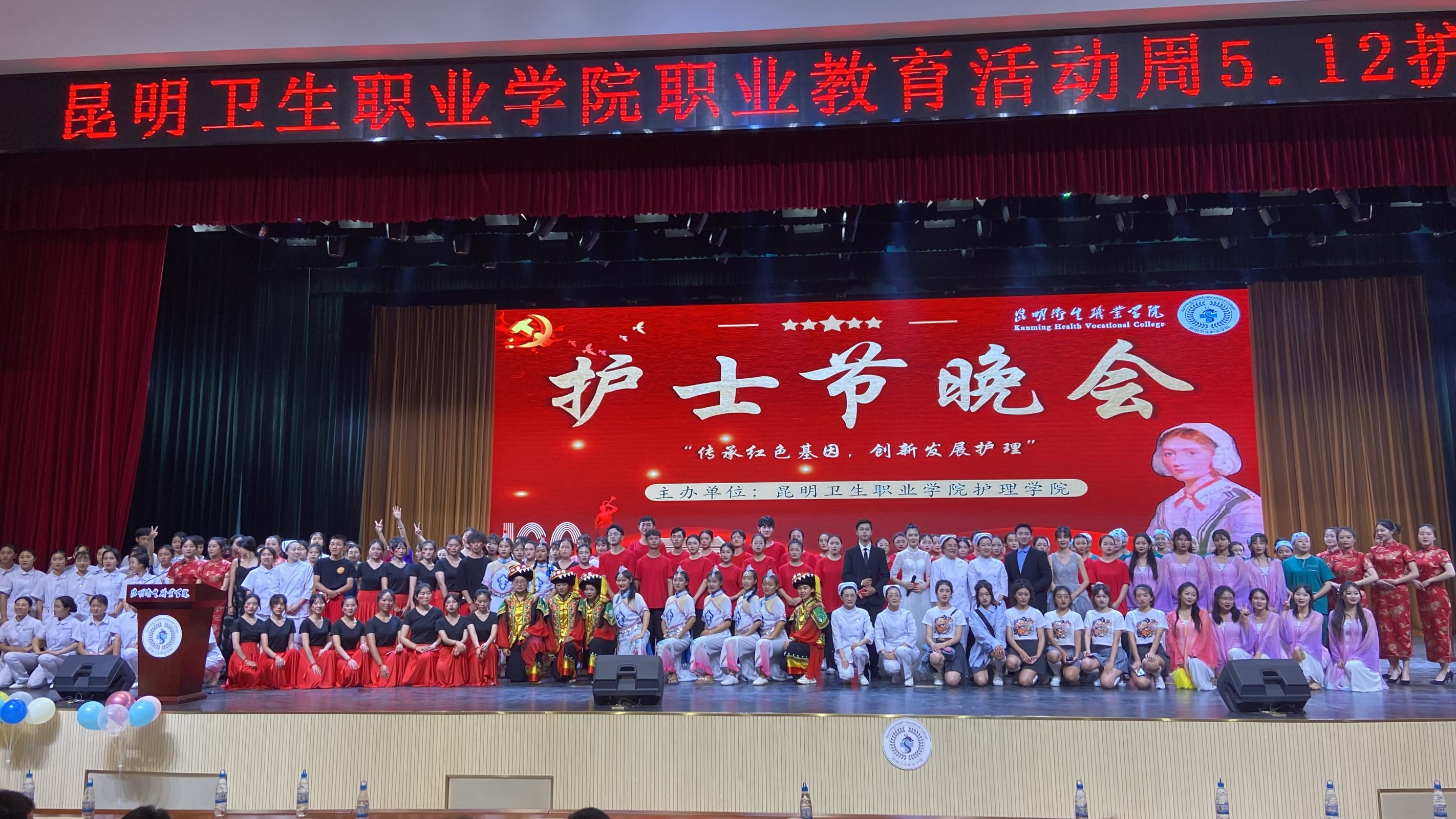 健康所系,性命相托,终身纯洁,忠贞职守。为迎接第110个国际护士节,弘扬南丁格尔精神,传承护理文化,丰富校园生活,使学生稳固职业思想,提升职业素养,塑造职业形象,培育创先争优意识。结合beat365平台官方网站职业教育活动周方案,护理学院于5月25日晚19:00在明德会堂举行了以“传承红色基因 创新发展护理”为主题的5·12护理晚会。