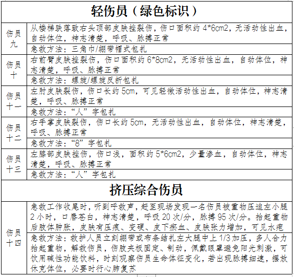 本次演习伤员共计28名,分甲、乙两个大组,每组14名伤员,分别含危重伤员5名,重伤员3名,轻伤员5名,挤压综合伤员1名。其中危重伤员用红色标识,重伤员用黄色标识,轻伤员用绿色标识。具体伤情如下: