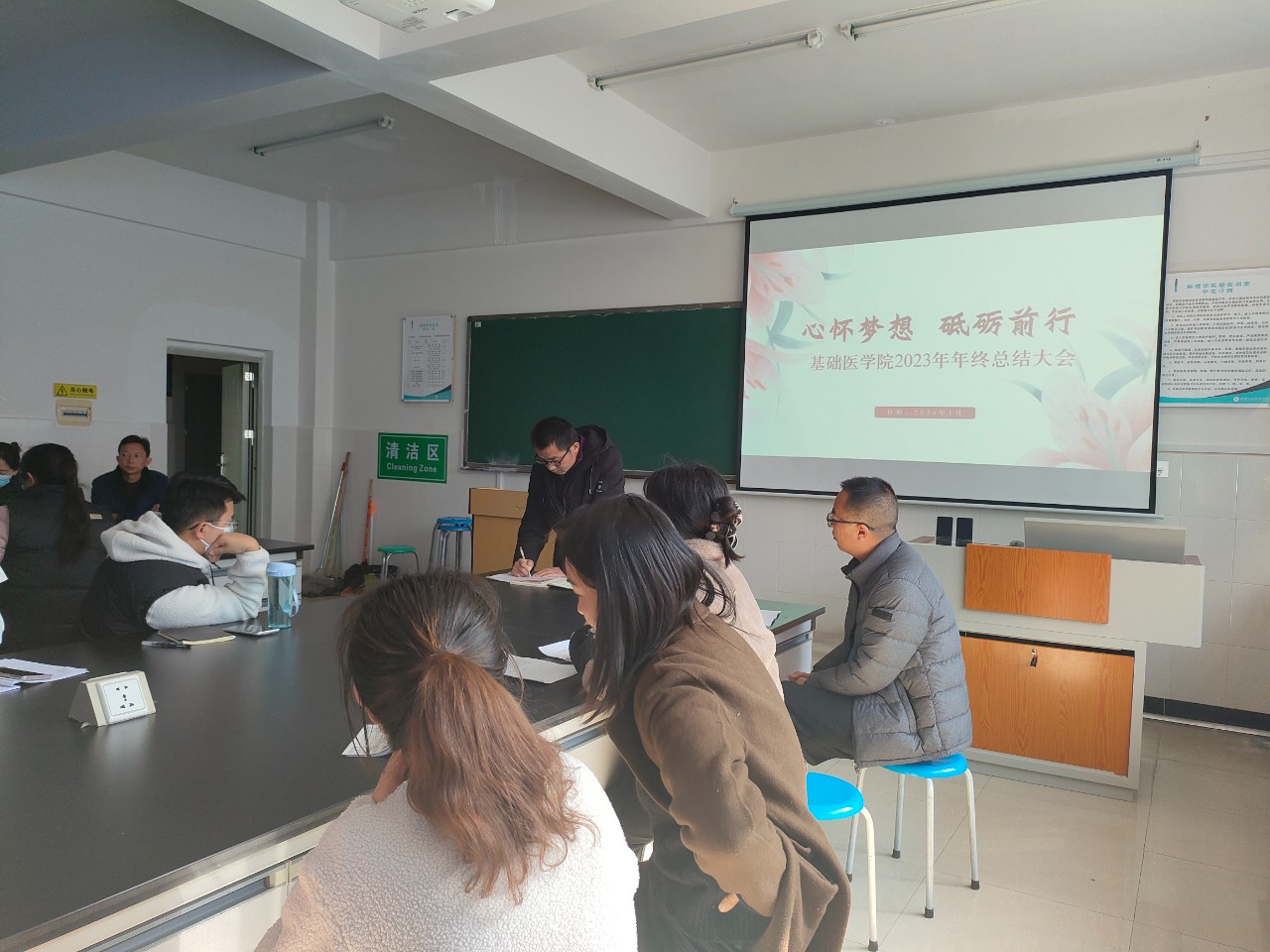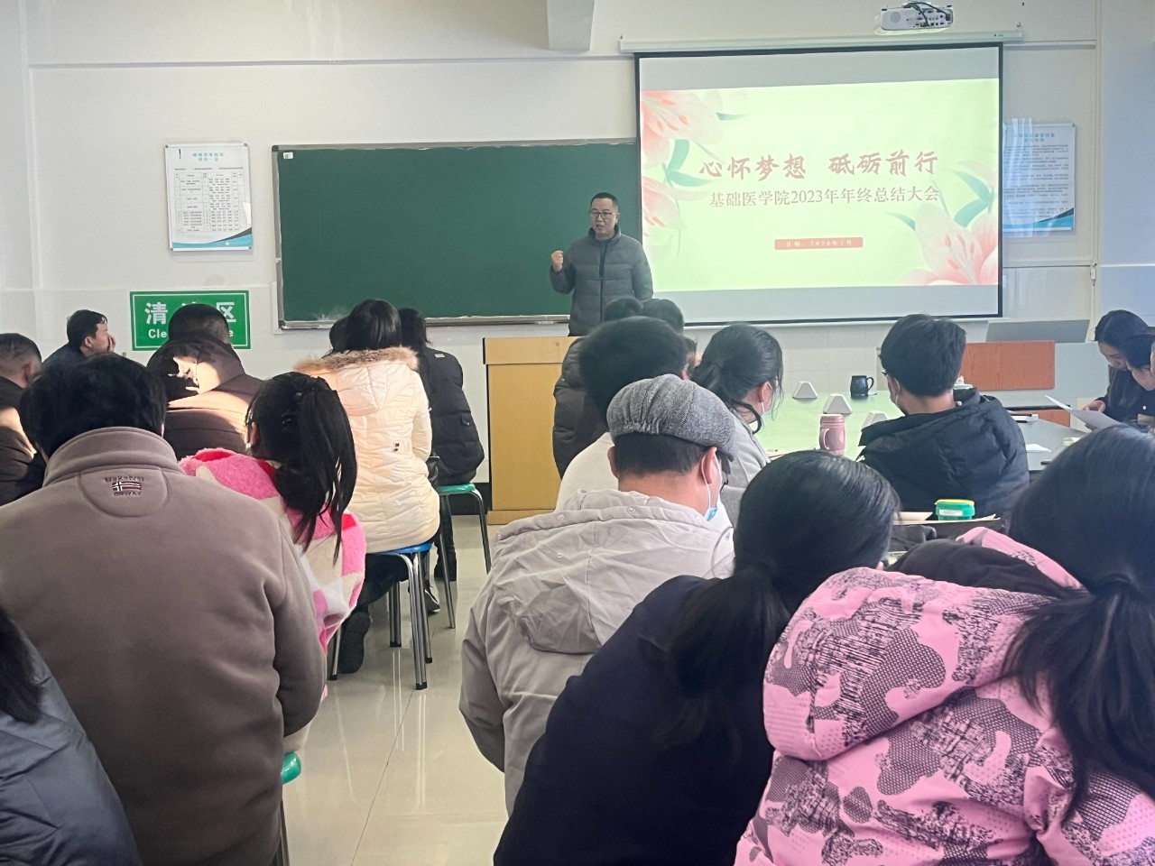 2024年1月11日下午,基础医学院召开2023年终总结大会,会议以“心怀梦想,砥砺前行”为题,副院长罗正超主持会议,全体教师参会,大家一同总结过去、展望未来。
