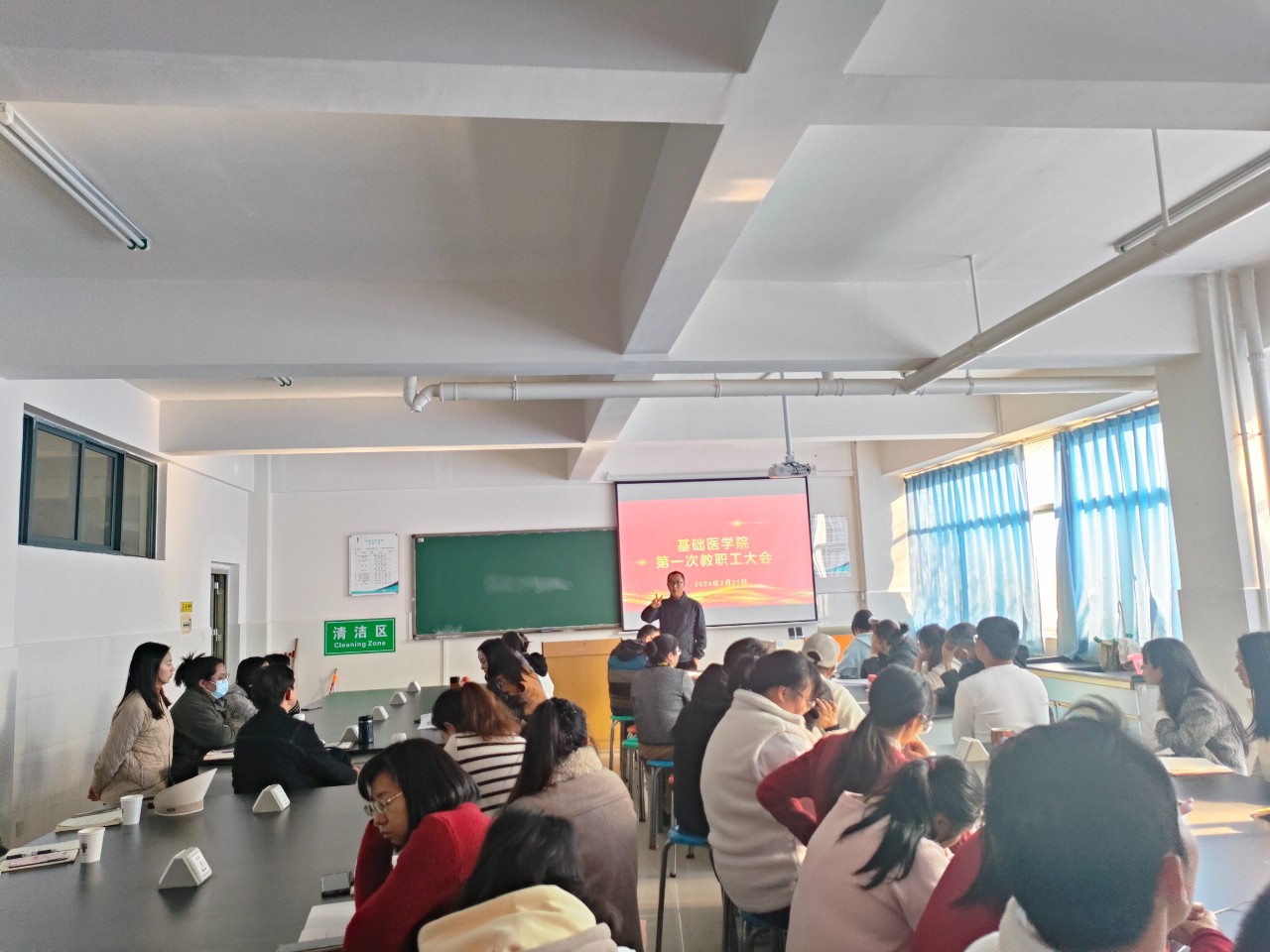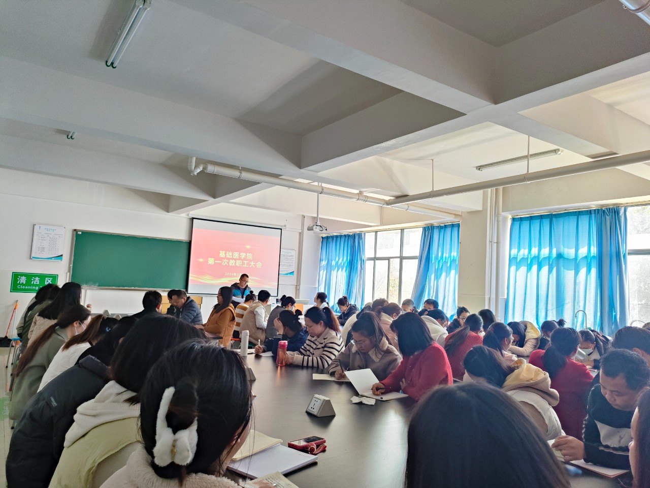 为做好新学期教学工作部署,2024年2月21日下午,基础医学院召开第一次教职工大会,会议由副院长罗正超主持,全体教职工参与。