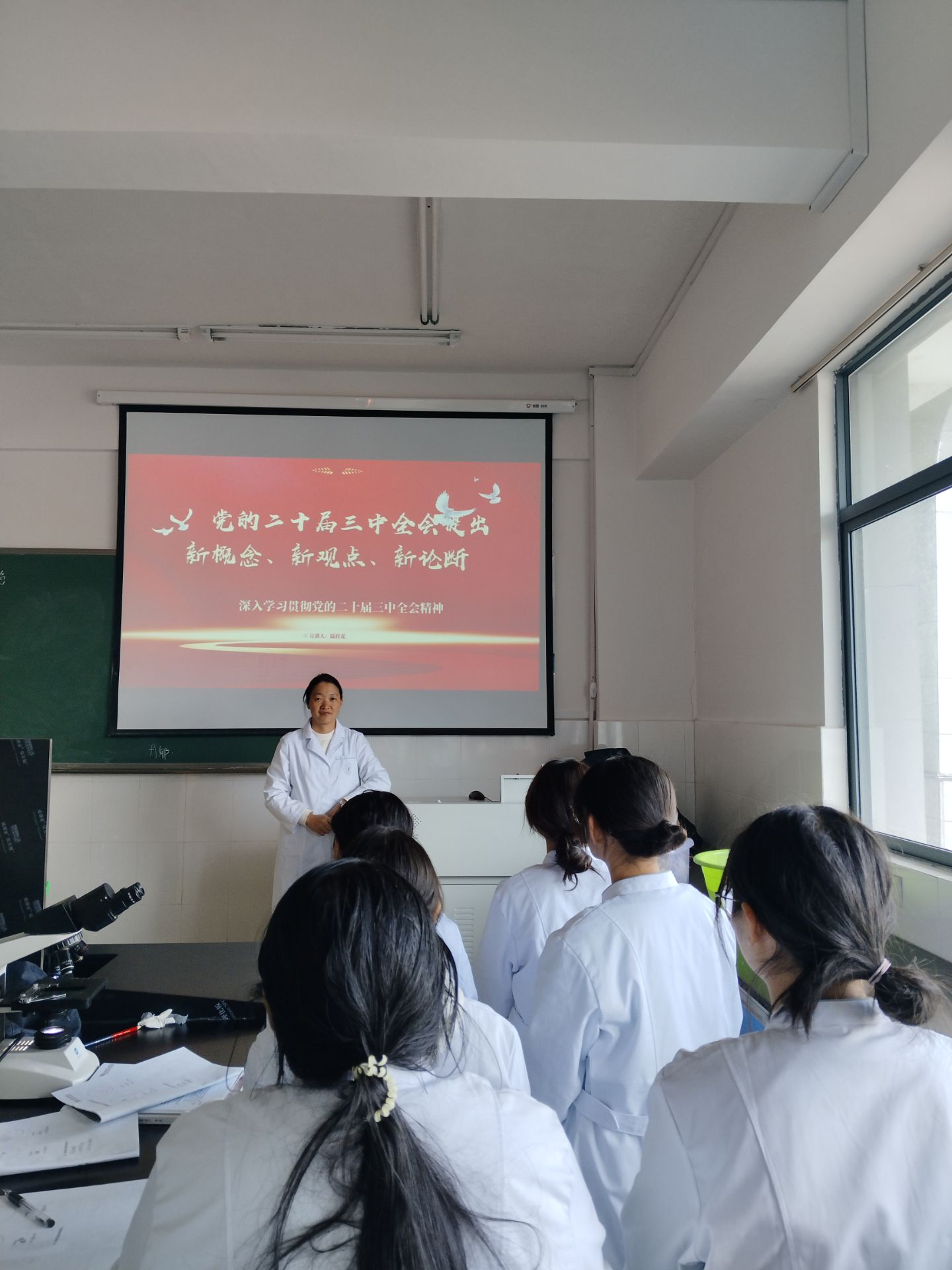 为深入贯彻学习党的二十届三中全会精神,充分发挥党员先锋作用,基础医学院于2024年11月22日和12月6日开展微党课学习活动,活动由直属党支部书记李睿雯主持,宣传委员肖雪妍、组织委员陆桂花主讲,全体教师们踊跃参与。