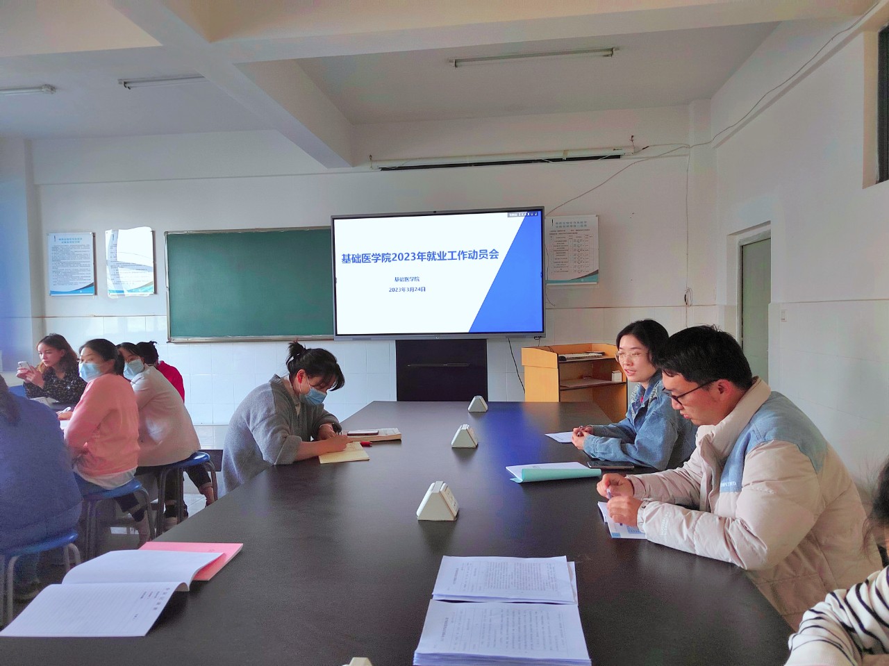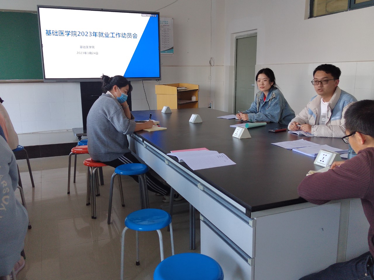 为深入实施就业扩容提质工程,用实际行动践行学习贯彻落实党的二十大精神,落实党中央、国务院“稳就业”“促就业”决策,响应学院的“多部门联动帮扶毕业生促进就业方案”,进一步拓宽毕业生的就业渠道,开拓更多高质量就业岗位,3月24日下午,基础医学院召开了2023年就业工作动员会。会议由基础医学院党支部书记李睿雯主持,护理学院第一党支部书记尹培及基础学院全体教师共同参会。