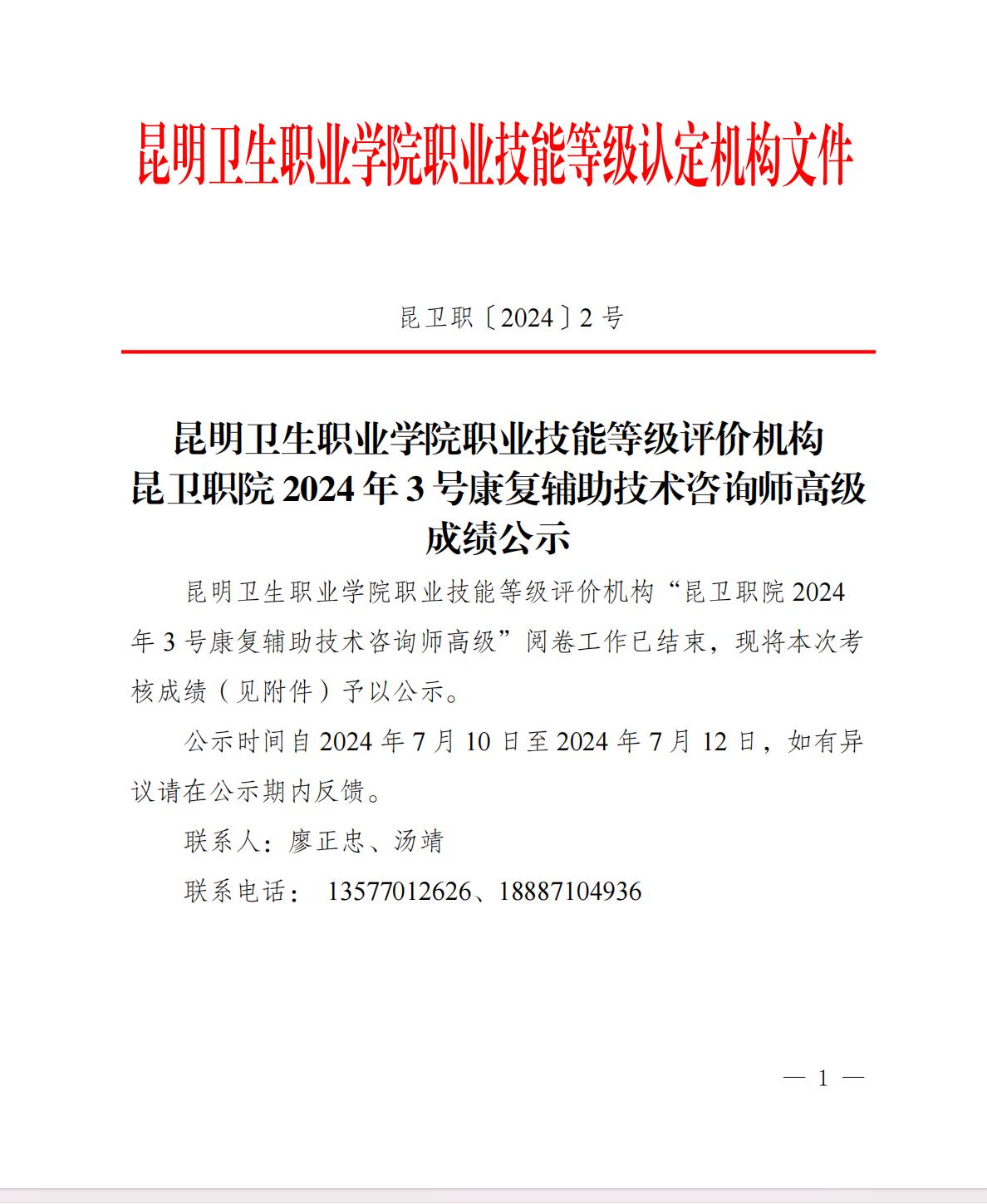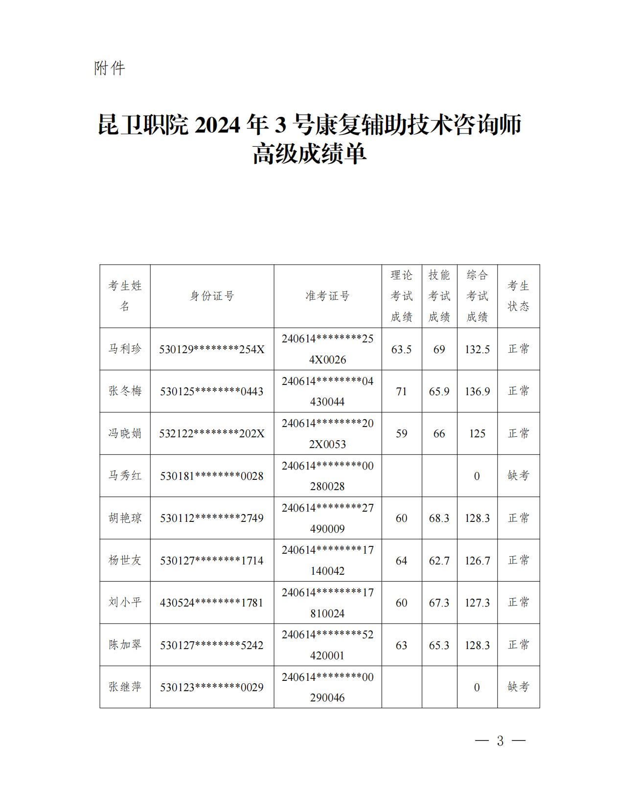 beat365平台官方网站职业技能等级评价机构昆卫职院2024年3号康复辅助技术咨询师高级成绩公示