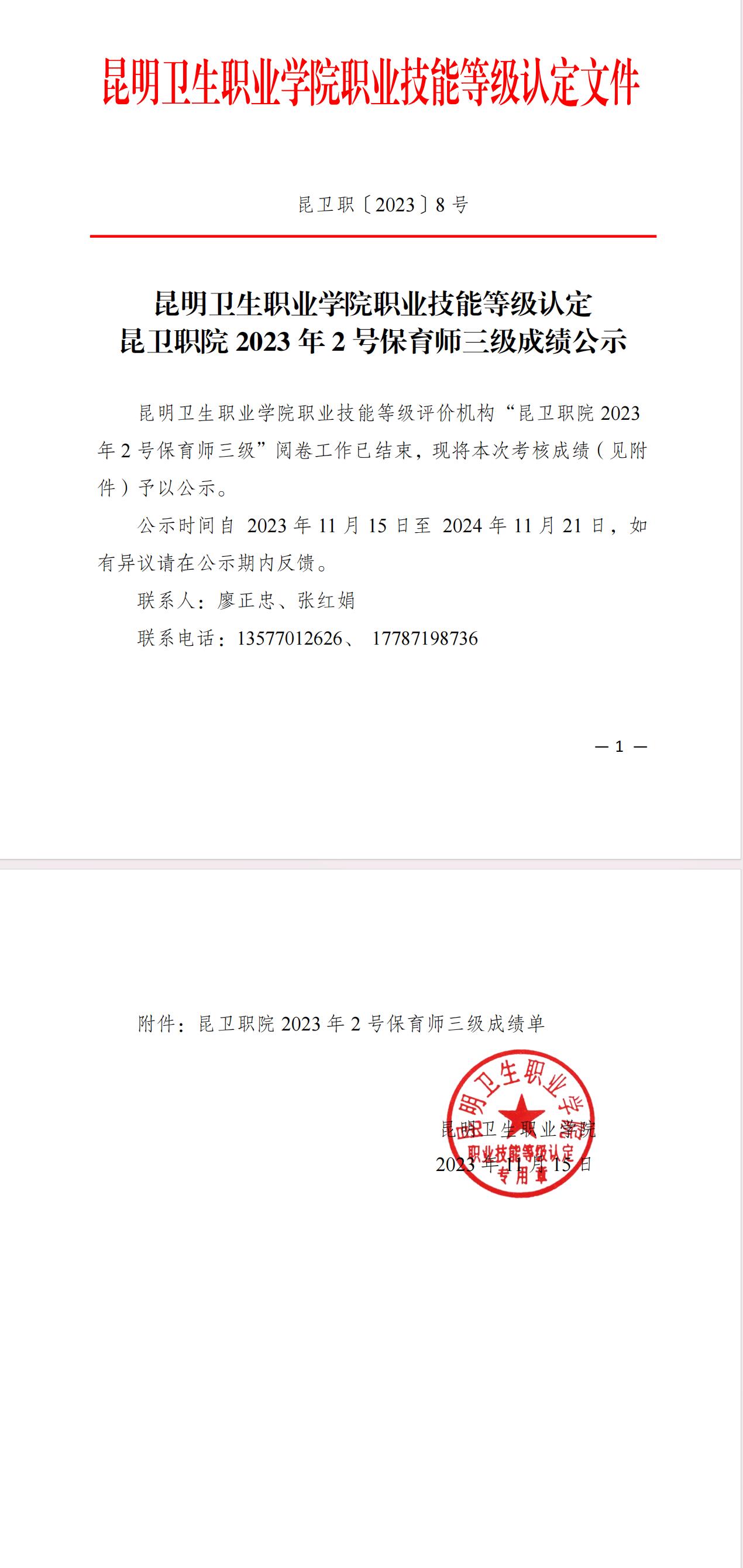 附件昆卫职院2023年2号保育师三级成绩单.pdf