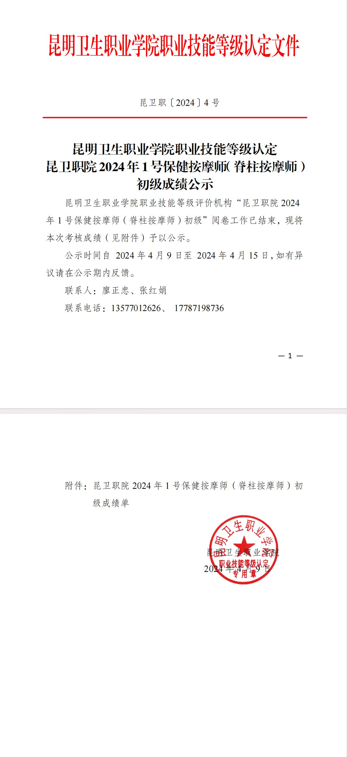 附件昆卫职院2024年1保健按摩师(脊柱按摩师)初级成绩单.pdf