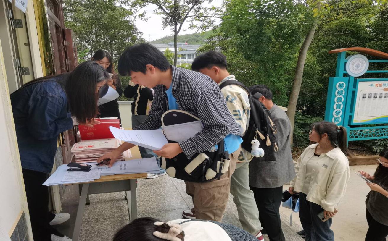 发放现场,学院门口设置了清晰的指示牌,学生们在老师的引导下,按照确认机构号有序排队。尽管学生人数众多,但现场秩序井然,每一位学生都表现出了良好的素养和耐心。老师也以专业的态度,认真核对每一位学生的信息,确保每一本证书都能准确无误地发放到学生手中。