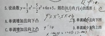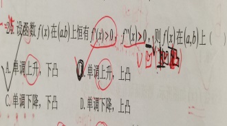 第21题 | 若函数 在 内连续且二阶可导,且 且 , 则函数在 内,则必有( ) A.单调减少,图形下凹 B.单调增加,图形下凹 C.单调减少,图形上凹 D.单调增加,图形上凹 答案:A | ||