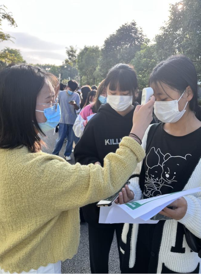 考试当天,考务人员根据疫情防控要求,对考生进行体温测量,检查两码一表,提醒考生务必全程佩戴口罩。