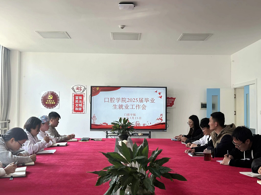 为全面落实推进学校就业工作部署,切实做好2025届毕业生就业服务工作,口腔学院于2025年3月25日在学院会议室召开2025届毕业生就业工作推进会。学院领导班子、全体任课教师及辅导员参加会议。