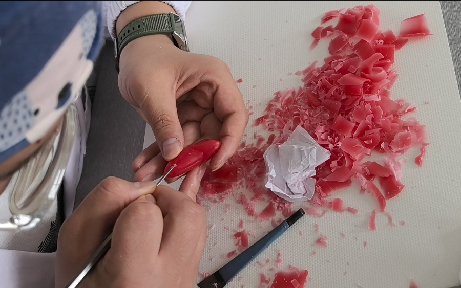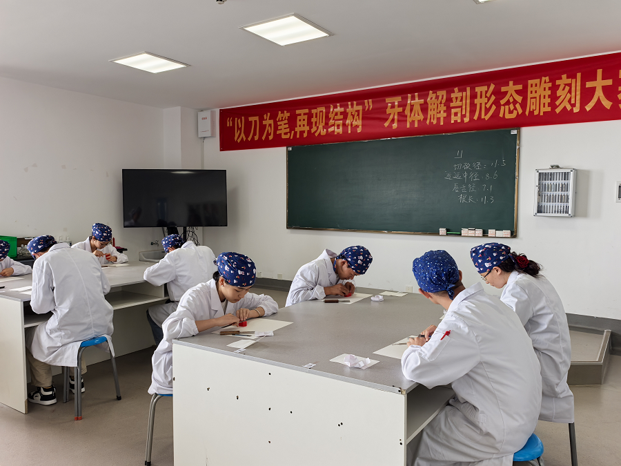 本次比赛需参赛选手在规定时间内完成上颌中切牙的蜡牙雕刻。比赛要求严格,从牙体形态的精准度、比例协调性到细节处理的细腻度均纳入评分标准,全面考验学生的解剖学知识、空间想象力和手部操作能力。决赛现场,选手们手持雕刻刀,专注地在蜡块上精雕细琢,将理论知识转化为具象的专业技能,一件件形态逼真、结构严谨的作品脱颖而出,赢得评委一致好评。