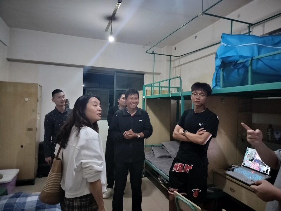 为深入了解2025级新生入住情况,帮助新生快速适应校园生活,8月30日晚,口腔学院直属党支部书记骆毅、口腔学院院长虎志辉、副院长张晓刚及学生管理负责人陈振军带领各级领导成员及全体辅导员,分别前往男生宿舍2栋与女生宿舍7栋,开展新生宿舍走访慰问工作。