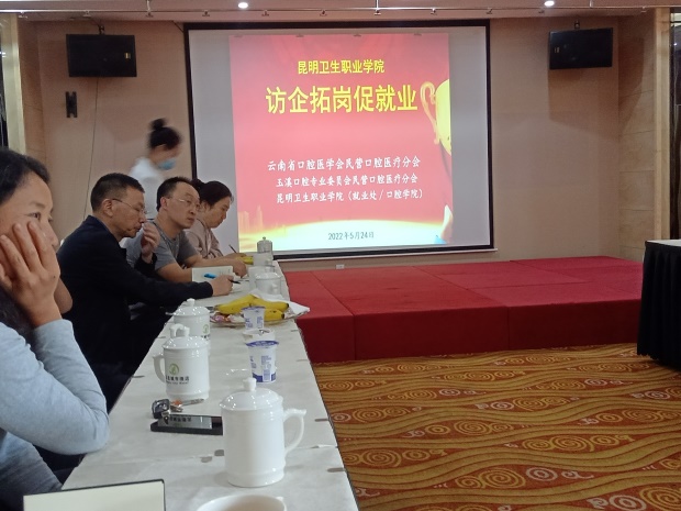 为了贯彻落实教育部全国高校书记校长访企拓岗促就业专项行动。加快健全高校毕业生市场化社会化的就业创业工作机制,千方百计开拓更多就业创业岗位和机会。口腔学院按照学院“百日冲刺”促就业方案,积极主动联系单位扩展就业岗位,于5月26日口腔学院支部书记骆毅、副院长虎志辉、张晓刚,学院就业处刘婧等同志到玉溪与云南省口腔医学会民营口腔医疗分会和玉溪口腔专业委员会民营口腔医疗分会10多家会员单位进行座谈交流,双方就提升学生竞争力,促进学生就业进行深入交谈。