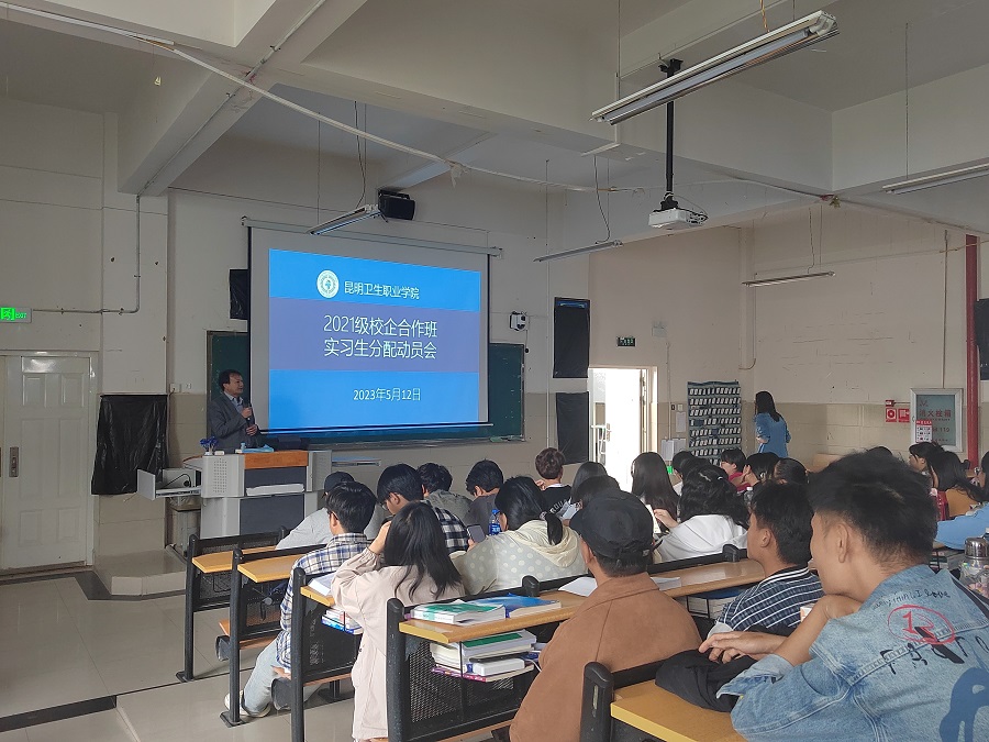于5月12日口腔学院针对校企合作试点班2021级3.4班同学进行实习前校企合作单位实习生选拔动员会议,邀请了与学院多年合作的昆明硕博口腔保健知识咨询有限公司董事长赵青副主任医,口腔学院骆毅书记、张晓刚副院长、辅导员王晓丽老师参与动员会议。