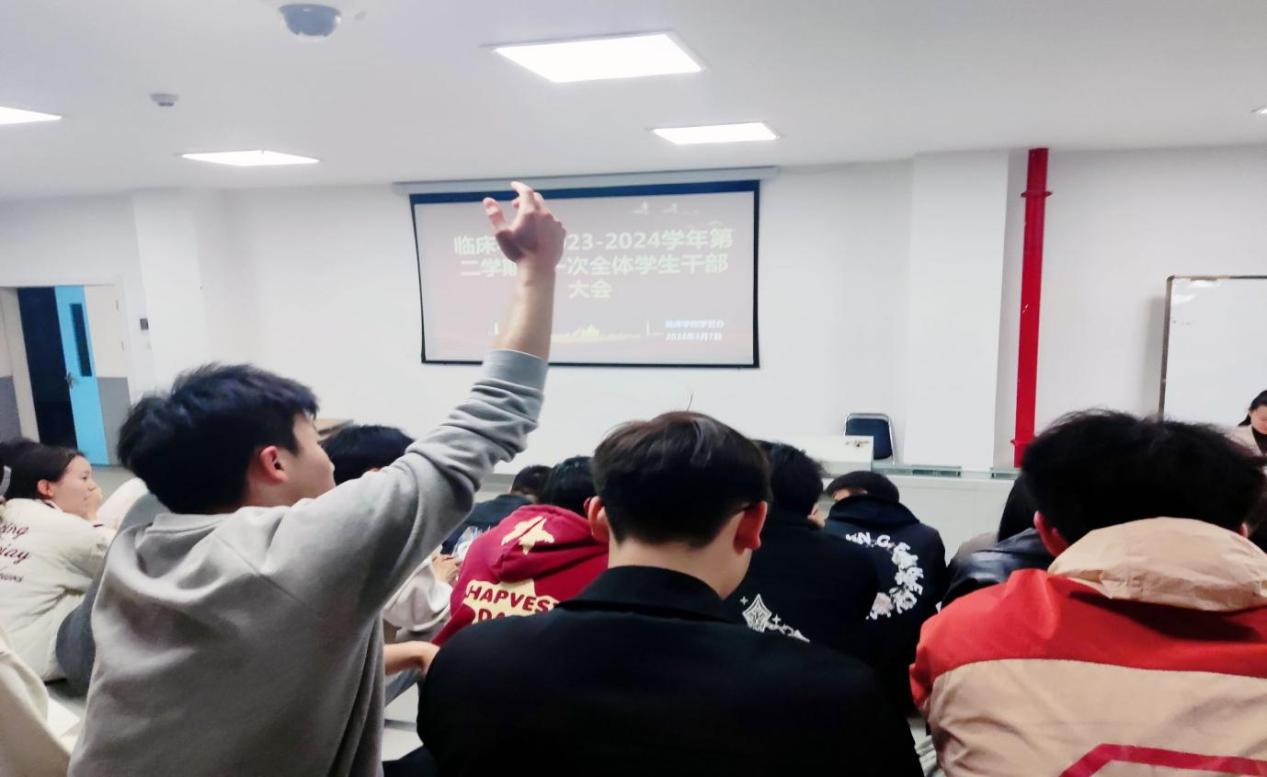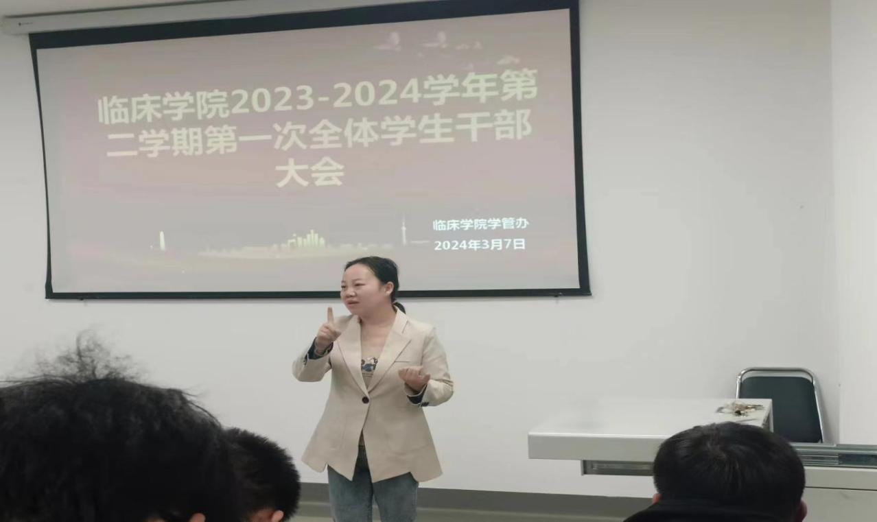 为进一步加强临床学院师生沟通联动,倾听学生心声,解决学生在校的实际困难和问题,提升学生管理服务水平,加强学生思想政治教育工作,3月7日晚,临床学院组织学生班干部代表在影像学院208室召开2023-2024学年第二学期第一次全体学生干部大会。临床学院学生管理负责人李建国、教学管理副院长唐敏、教学办主任邱亚、学管办主任敖宇蓉、临床学院党总支部书记王正安、一支部书记王德昌、二支部书记杨林杰以及学生干部代表参加,本次会议由李建国老师主持召开。