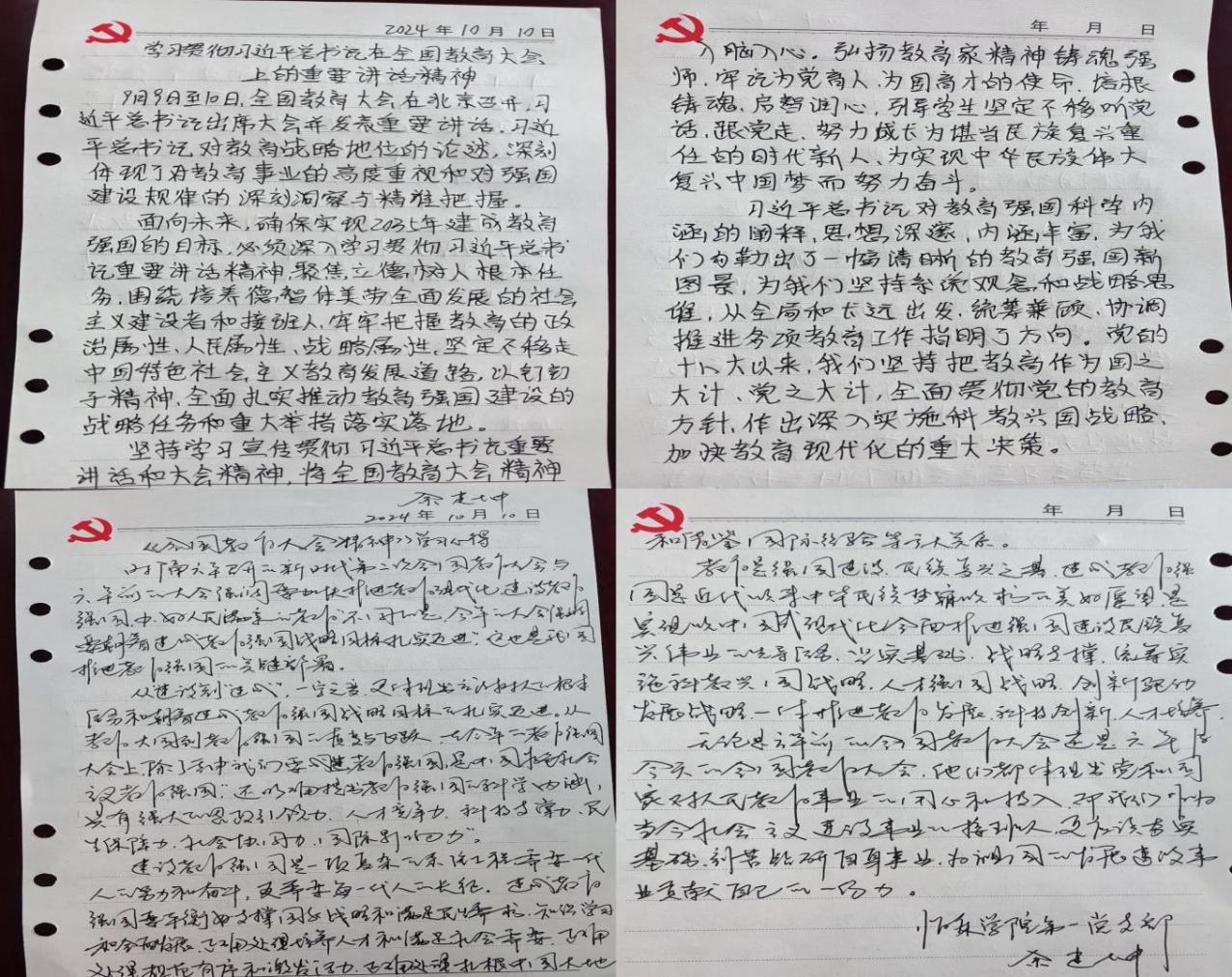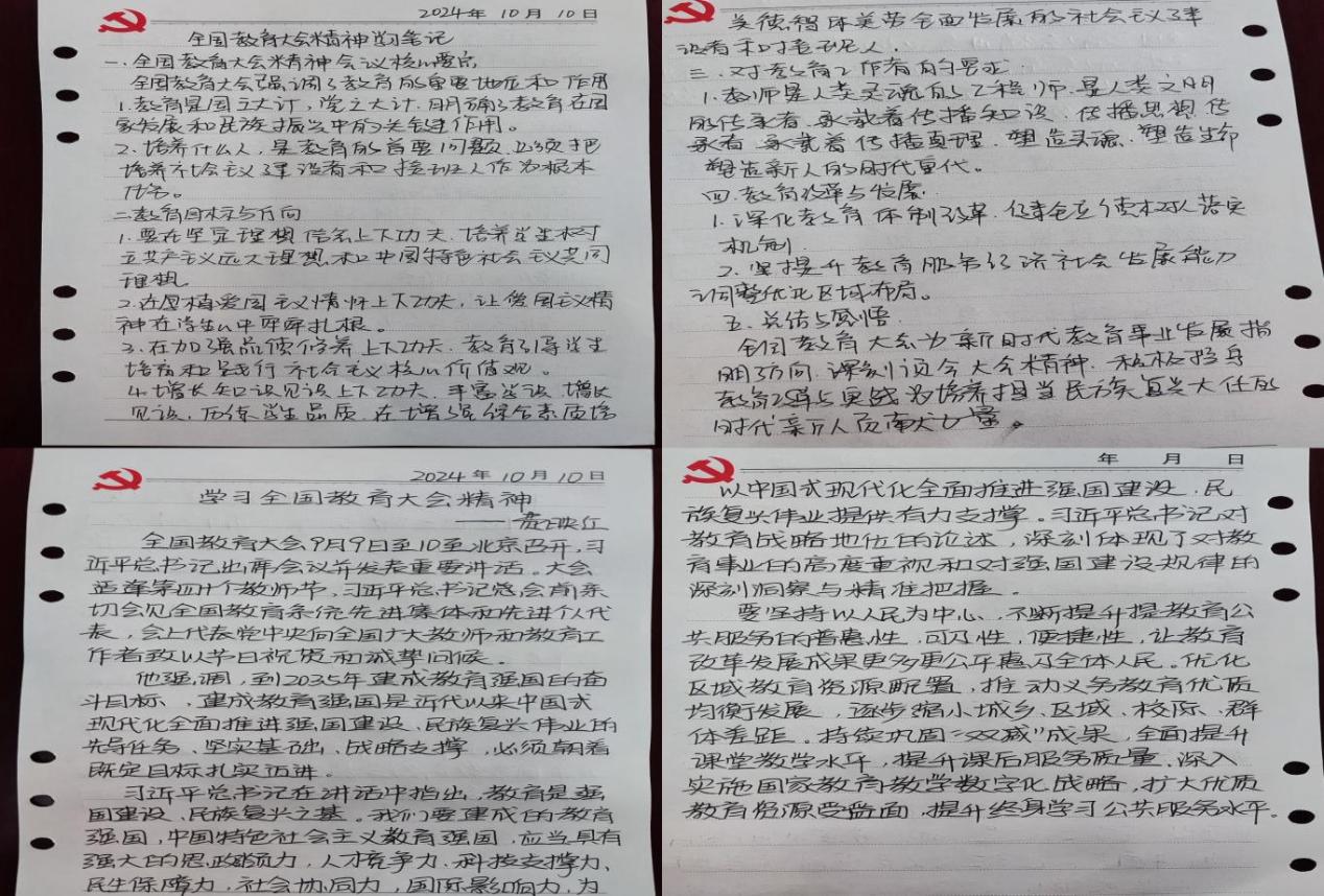 与会人员认真做学习笔记,并围绕全国教育大会精神,结合自身工作实际,展开了热烈的讨论。大家纷纷表示,要以全国教育大会精神为指引,牢记为党育人、为国育才的使命,为培养德智体美劳全面发展的社会主义建设者和接班人贡献自己的力量。王正安书记指出,我们要弘扬教育家精神,牢记为党育人、为国育才的使命,认真领会教育强国建设的系统部署,切实增强“四个意识”、坚定“四个自信”、做到“两个维护”,全面贯彻党的教育方针,培根铸魂、启智润心,努力培养德智体美劳全面发展的社会主义建设者和接班人,朝着建成教育强国战略目标扎实迈进。