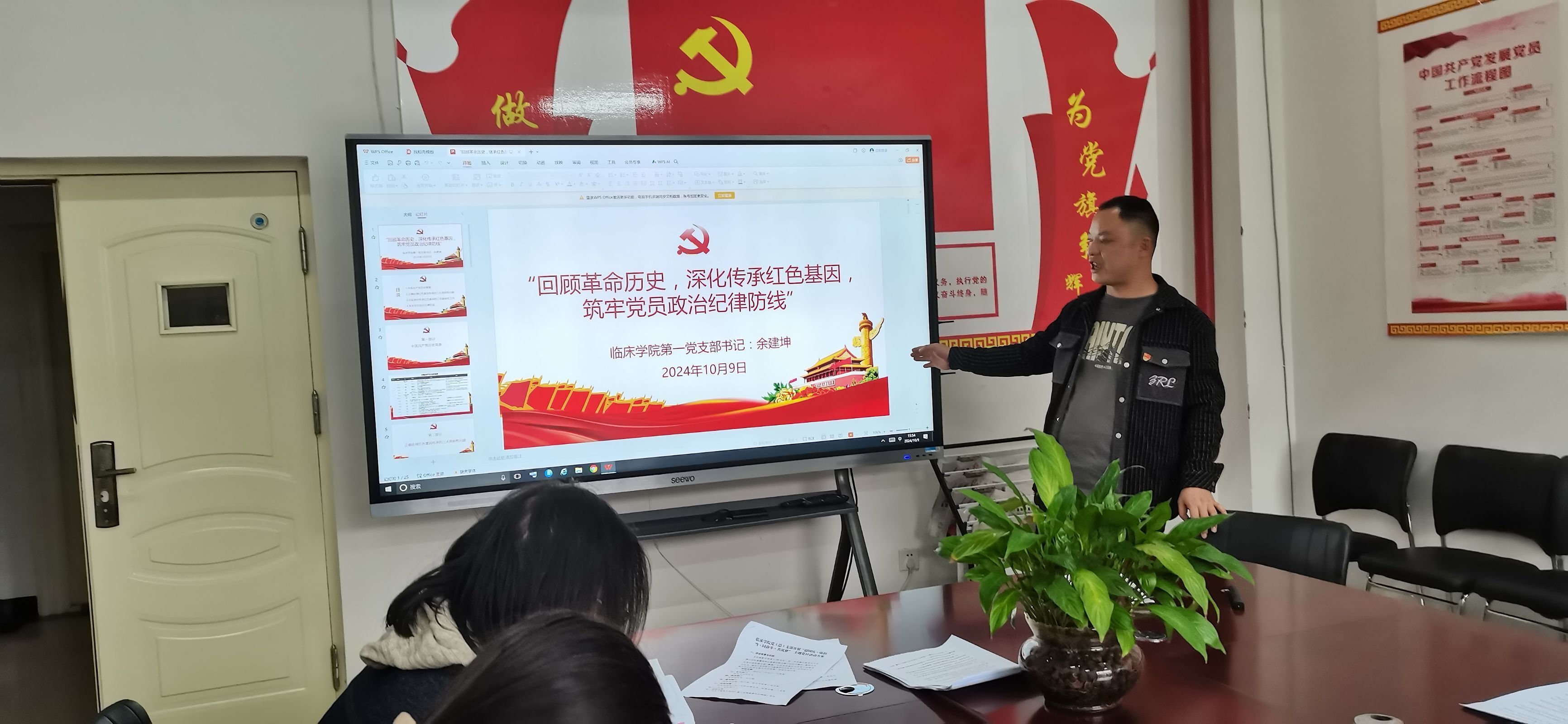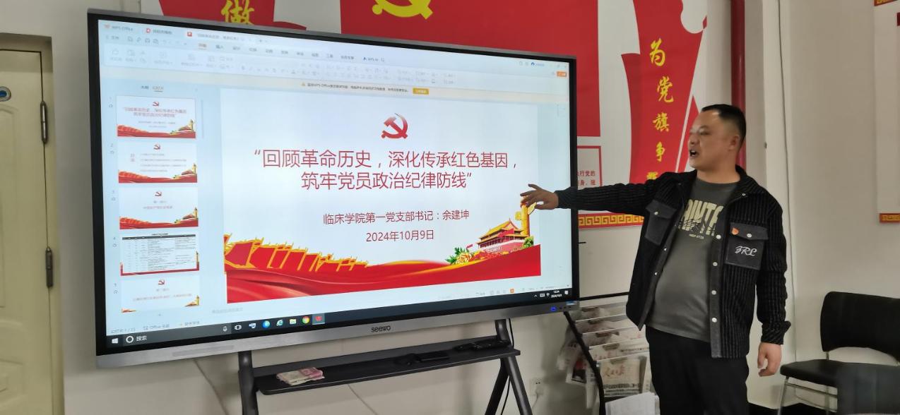 为了进一步加强党员的思想教育,增强党性观念,提高政治纪律意识,临床学院第一党支部于2024年10月9日在临床学院405室开展《回顾革命历史,深化传承红色基因,筑牢党员政治纪律防线》主题党课。本次党课由临床学院第一党支部书记余建坤同志主讲,本次党课旨在让党员同志进一步加强学习党的历史,筑牢党员政治纪律防线,进一步深化红色基因的传承,从而更好地发挥党员的先锋模范作用。