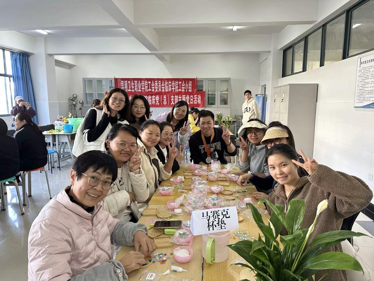 在运动盛会的热烈氛围里,临床学院工会小组于 2024 年 11 月 19 日,在临床学院405组织开展了一场以手工制作主题创意活动。此次活动为教职工搭建一个舒缓身心、消解压力并尽情展露创造力与想象力的舞台,活动内容包含马赛克杯垫制作、香薰石膏鲜花挂牌制作、扎染方巾以及流体熊 DIY 等项目,临床学院全体教师怀抱着极高的热情与期待,积极参与此次创意满满的手工制作活动,展现出了平日里在教学工作中较少呈现的别样风采与活力。