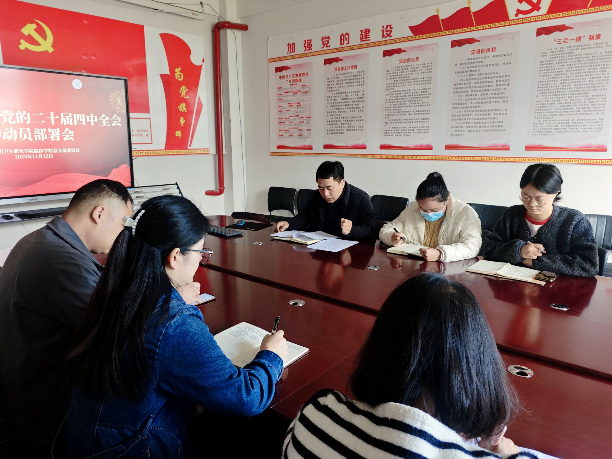 2025年11月12日上午,临床学院党总支在临床405党员活动室召开学习宣传贯彻党的二十届四中全会精神动员部署会。临床学院党总支书记杨登光、第一支部书记余建坤、第二支部书记杨林杰、第三支部书记张雪雪及党总支全体委员参加会议。本次会议由杨登光书记主持。