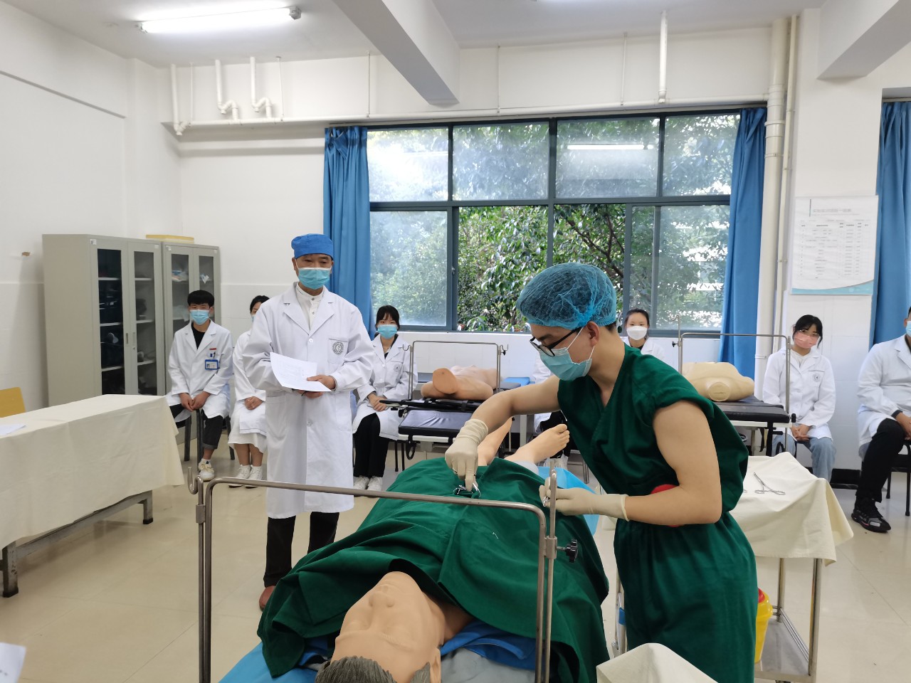 决赛的技能操作部分于5月11日如期举行,选手们个个迫不及待一展身手,早早的来到赛前休息室等候。学院还倡导未参赛的2021级高职临床和18级五年制医学美容技术专业的同学争当大赛志愿者,二十多名经学院精心挑选的志愿者服装整齐、行动迅速,在各赛室热情服务。