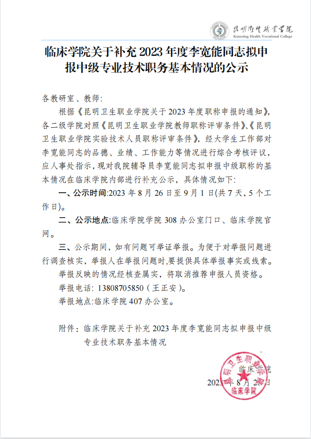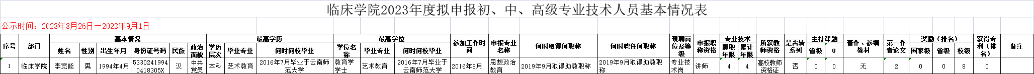 临床学院关于补充2023年度李宽能同志拟申报中级专业技术职务基本情况的公示