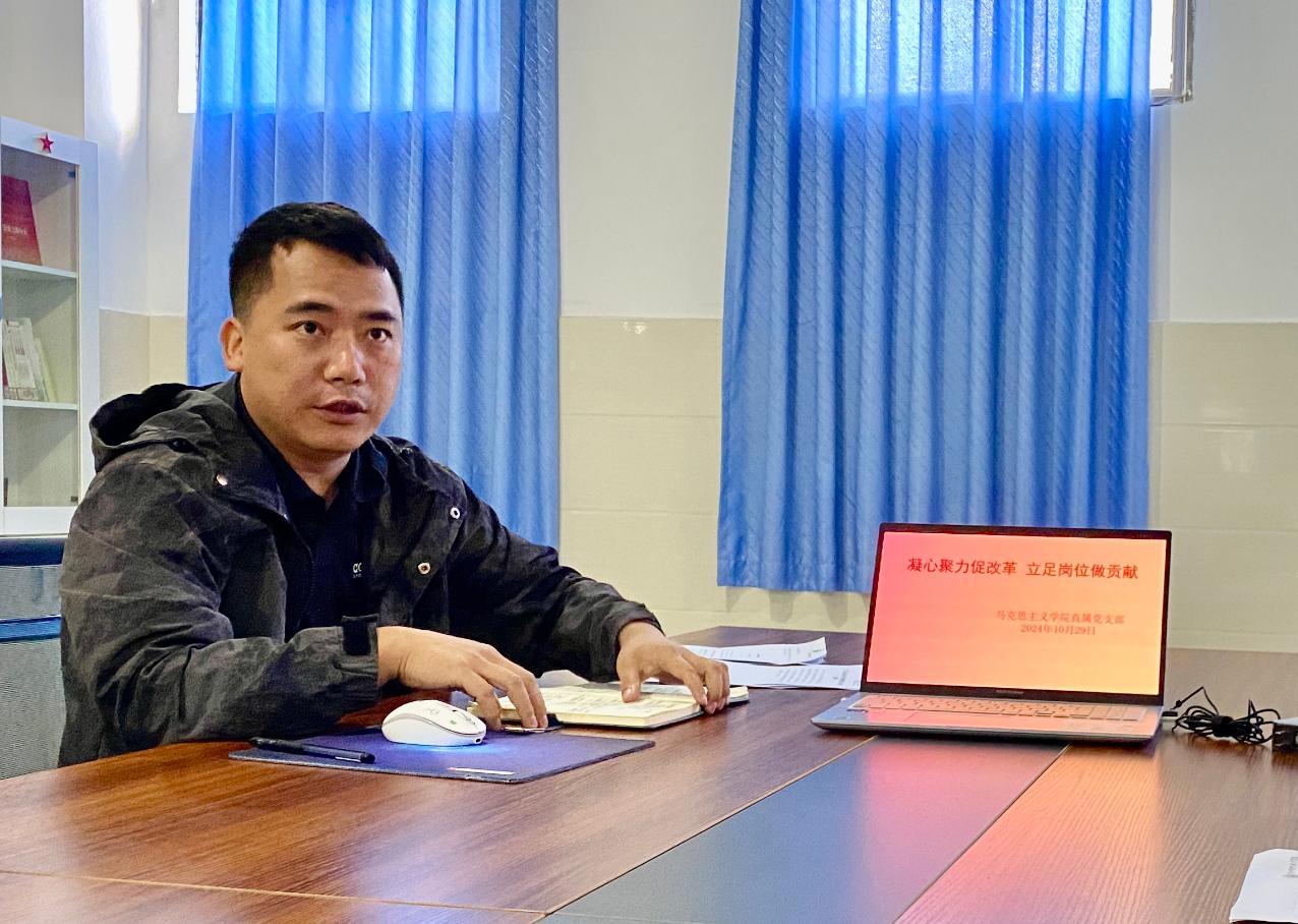 在新征程的时代背景下,马克思主义学院直属党支部2024年10月29日召开了一场别开生面的党员大会,主题为“凝心聚力促改革,立足岗位做贡献”。支部书记杨登光强调,面对时代的挑战与机遇,全体党员应当以时代楷模杨士莪为榜样,坚持信念、勇于创新,积极投身改革实践,发挥党员的先锋模范作用。