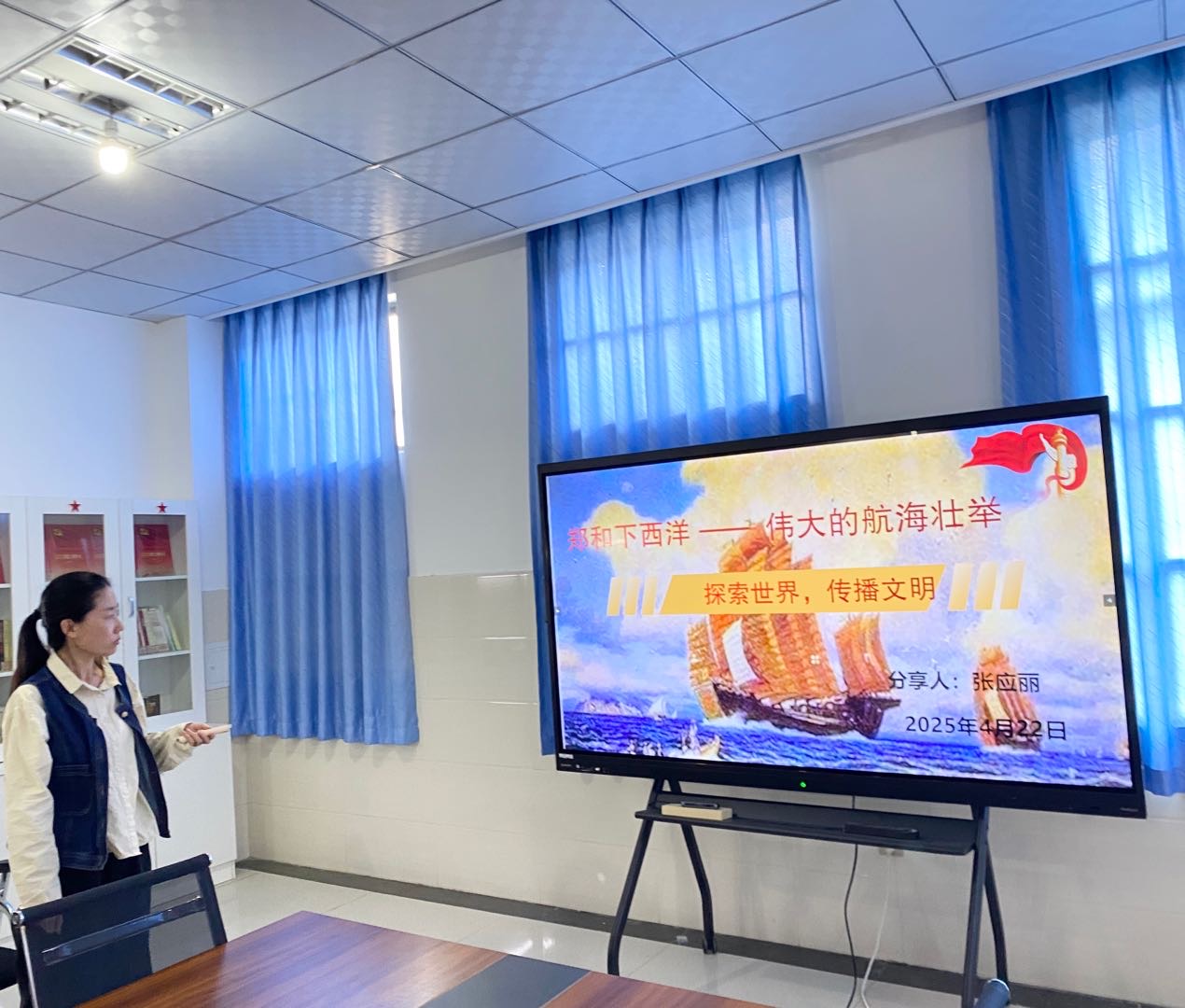 在第30个世界读书日来临之际,马克思主义学院直属党支部于4月22日组织开展“红色故事进课堂”读书分享活动,引导教师从红色经典中汲取精神力量,厚植爱国主义情怀。党员教师张应丽以“郑和下西洋——伟大的航海壮举”为题,为党员教师带来了一场兼具历史深度与现实意义的分享。会议由支部书记杨丽琴主持。