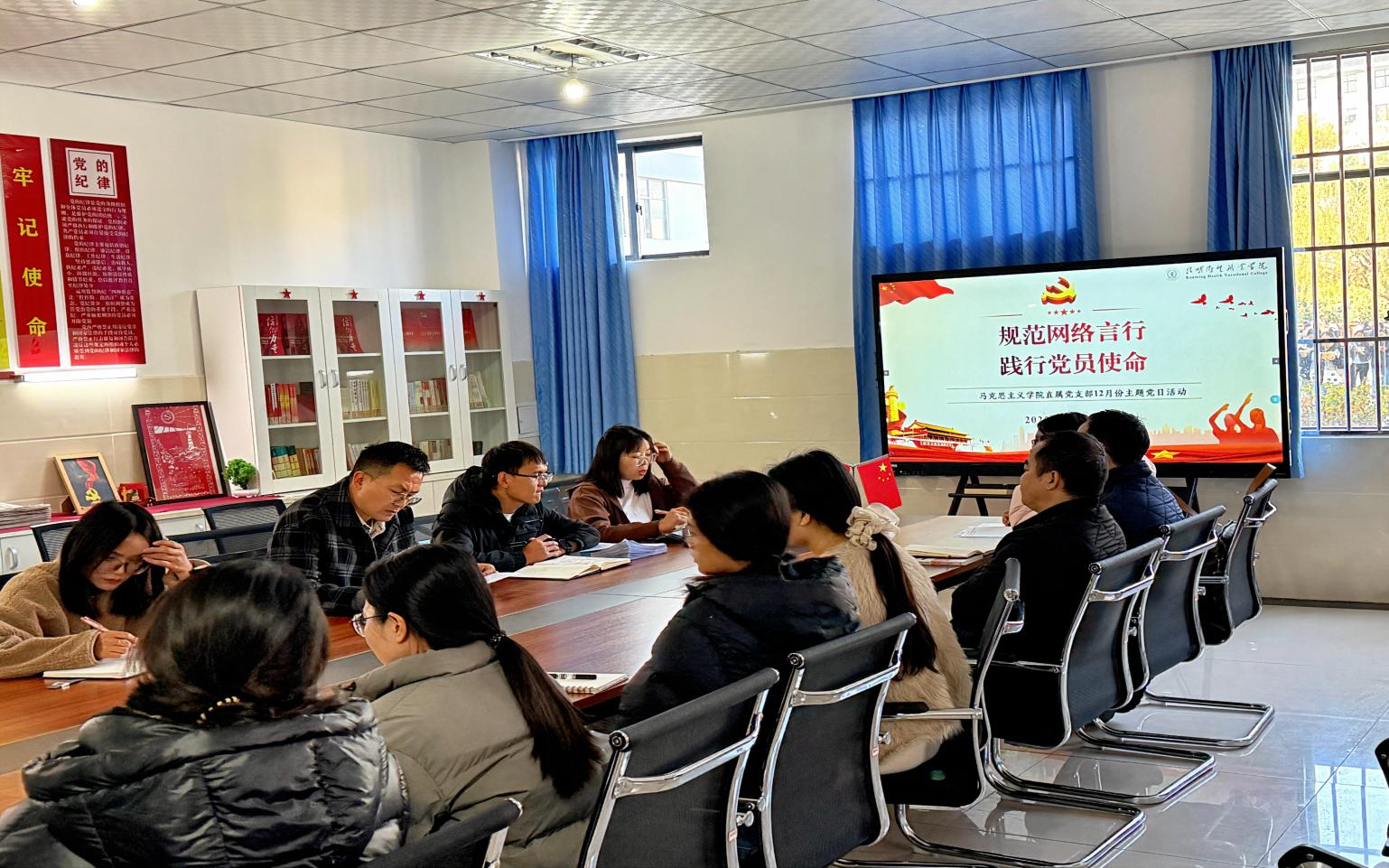 为深入学习党的二十届四中全会精神,贯彻习近平总书记关于网络生态治理的重要论述,强化党员教师网络行为规范意识,筑牢网络意识形态安全防线,12月11日早上,马克思主义学院直属党支部组织全体教师开展“坚守网络阵地,践行党员使命”专题学习活动,以学促行划定用网“红线”,以诺践责彰显党员担当。