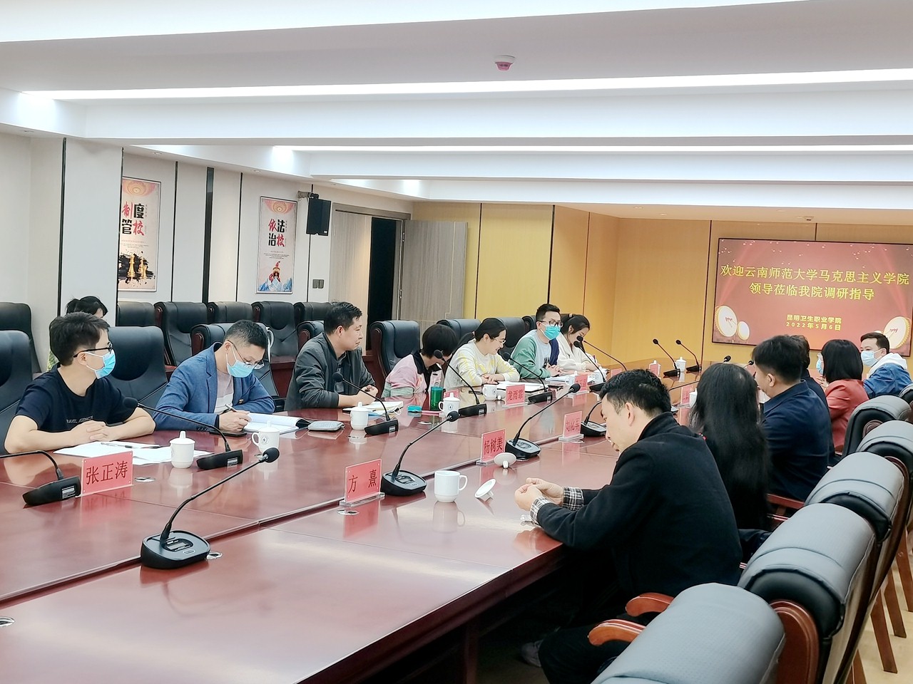 学院党委副书记张晓刚对云南师范大学马克思主义学院领导的到来表示热烈欢迎,教学副院长龙雨霏对学院发展状况、学科建设、人才培养、科研成果以及马克思主义学院教师队伍在学院中应该发挥的作用做经验分享,也希望同此次座谈交流共同搭建两校合作互助平台,加强师资培养,共同为社会培育有用之人。同时马克思主义学院负责人苏敏介绍了近年及“十四五”期间beat365思想政治课建设和思政教师队伍建设情况,人事处张正涛老师对近年来beat365聘用云南师范大学应届毕业生情况也做了详细分析和分享。云南师范大学马克思主义学院院长刘化军教授高度赞扬beat365发展,思想政治理论课建设取得的经验成果,同时介绍了云南师范大学马克思主义学院建设,人才培养等方面的情况,并希望通过此次交流学习加深合作、共同进步。