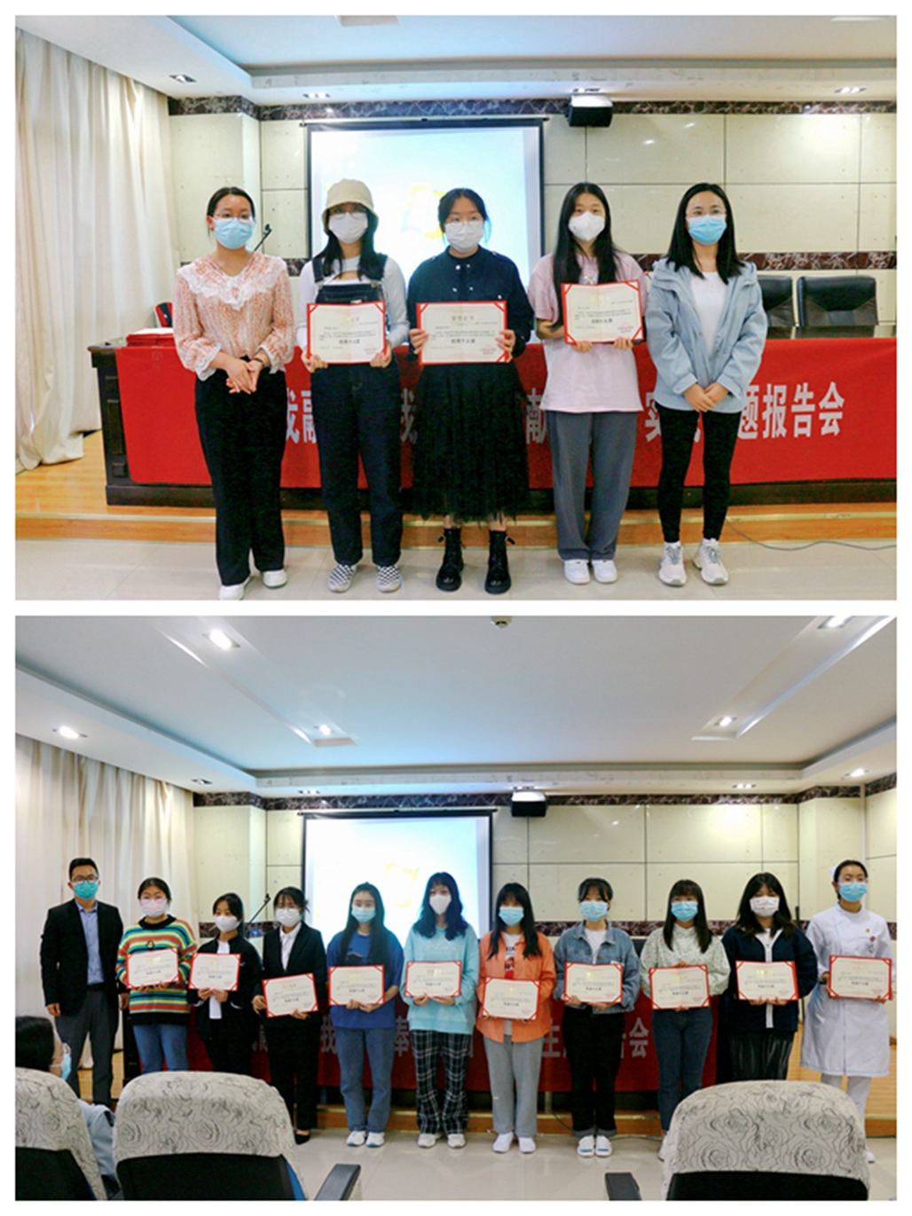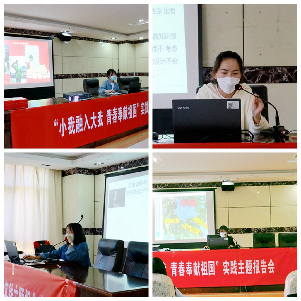 汇报会上,来自中医学院赵志燕同学以“缅怀为人,感受革命精神”讲述了自己家乡的一位老革命军人的故事,从赵志燕与这位老爷爷的采访中,我们可以感受到革命先烈们为了中华民族独立和国家尊严而做把自己的青春奉献给祖国,是他们为了建设和平,为了祖国的繁荣富强而贡献了青春和热血。赵琪琪同学以“心有锦缎,白衣逆行”为题,讲述了疫情期间,他和家人在云南瑞丽参加当地的抗疫工作。2021年暑以来,赵琪琪家人因为当地疫情有家而不能回,有家人但是没有相聚的日子,在岁月静好的背后是无数人的默默守候,他们是和平年代最接近危险的一群人,也是最美的逆行者。因赵琪琪同学的抗疫精神,受到了当地政府的表彰,在当地同他们在一线守护人民健康的还有很多很多。口腔学院的哎跳同学以“我心中的工匠”讲述了自己家乡的一位人物采访实践活动,扶助当地村民振兴特色产业,在政府的帮助和关心下,销售特色农产品,带领村民走出小康之路,平凡的工作中尽显精益求精的工匠精神,用青春之名向国家精准扶贫事业致敬。徐钰莹同学以“农村房屋承灾能力调查”为主题与部分志愿者深入到当地农村全面开展房屋建筑承灾能力调查,摸清和查明老百姓房屋建筑的承灾能力,为自然灾害对老百姓的居住所产生的影响而提前防治和应急。