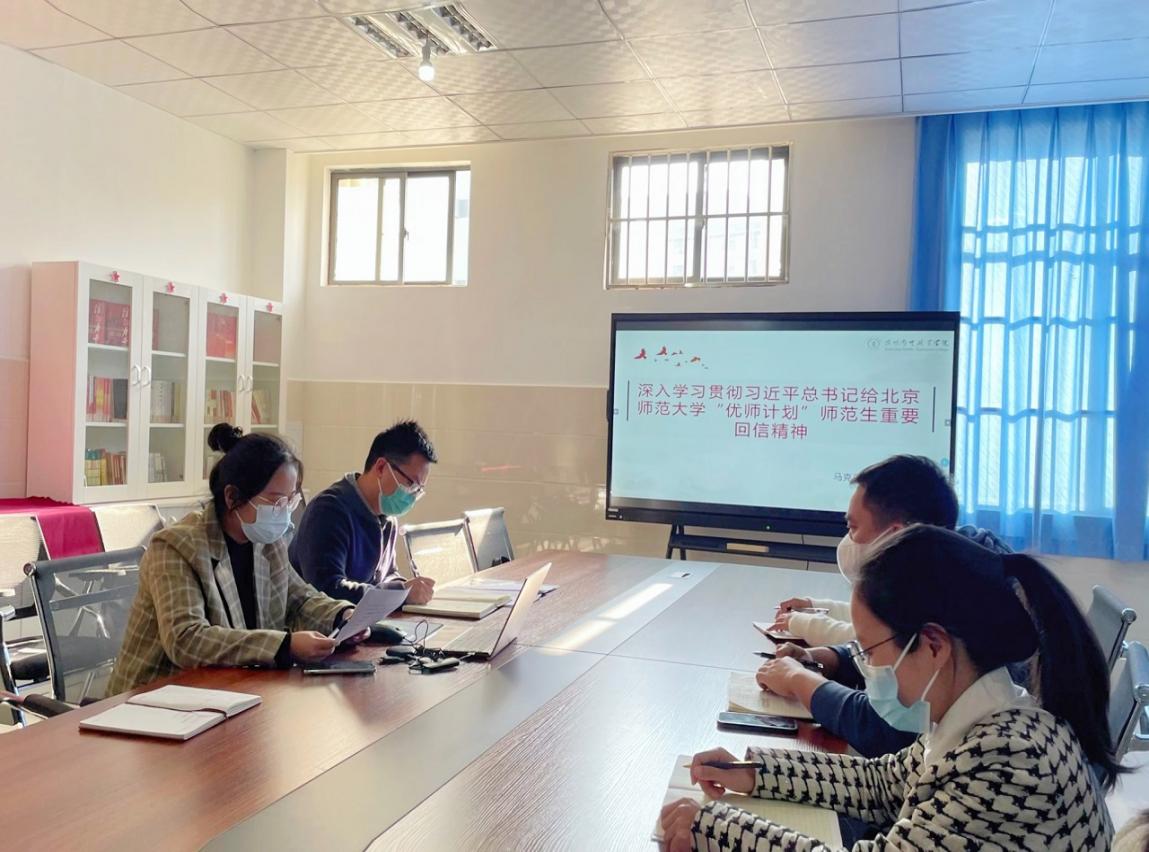 为深入学习贯彻习近平总书记给北京师范大学“优师计划”师范生重要回信精神,2022年10月18下午,马克思主义学院组织召开专题学习会议,围绕习近平总书记给北京师范大学“优师计划”师范生重要回信内容进行讨论交流。会议由综合办徐玲菲主持,马院全体思政课教师参加了本次会议。