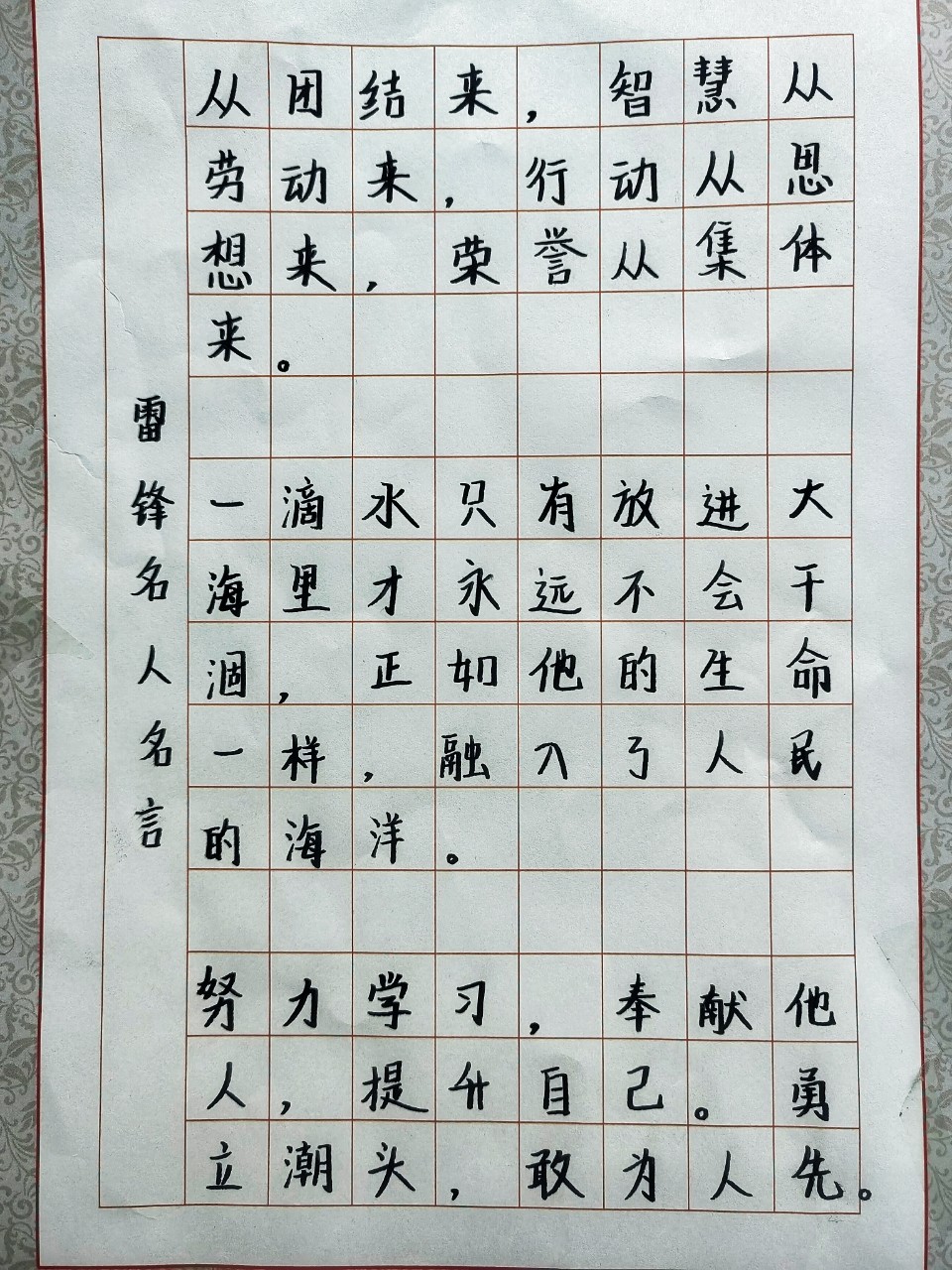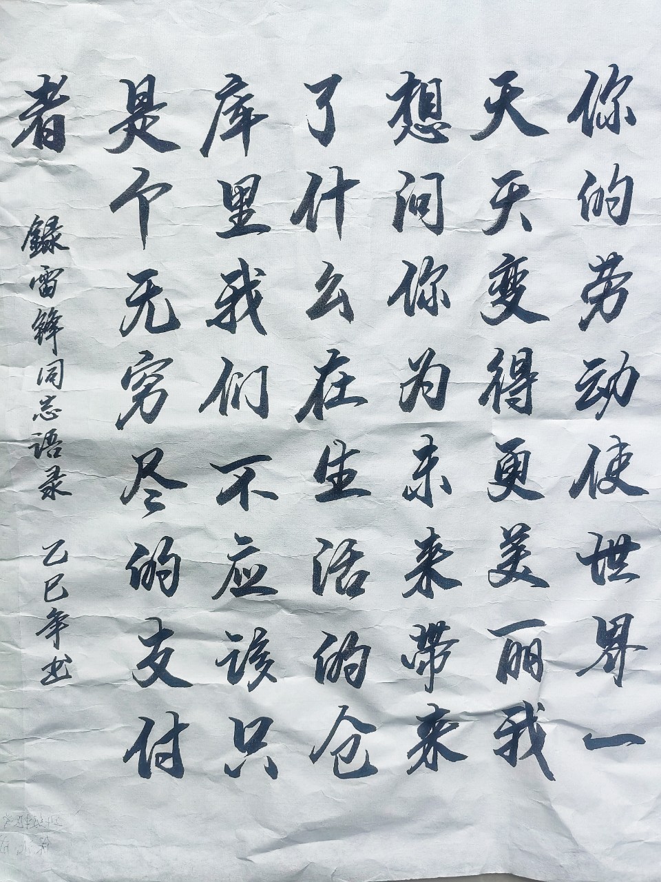 3月21日至25日,一场别开生面的规范字书写比赛在校园里精彩上演。本次比赛将书法艺术与雷锋精神深度融合,同学们一笔一划书写着雷锋语录,每一次提笔、运笔,不仅有效提升了书法技能,更沉浸式领悟了雷锋语录蕴含的精神力量,让雷锋精神在新一代青年中得以传承与延续,将雷锋精神内化于心、外化于行。
