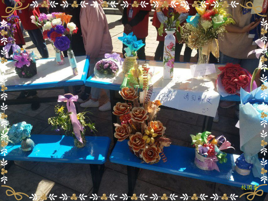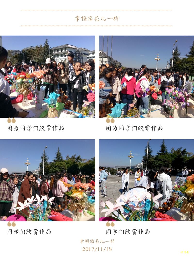 他们用双手创造了一个又一个精美而富有情感的花朵,远远望去在这个冬月就好似盛开一样,琳琅满目而又绚丽多彩的插花作品,吸引着同学们的目光。他们陆陆续续来到作品面前欣赏着、赞叹着,甚至情不自禁拿出手机拍照,表达出了对作品的赞美之情。